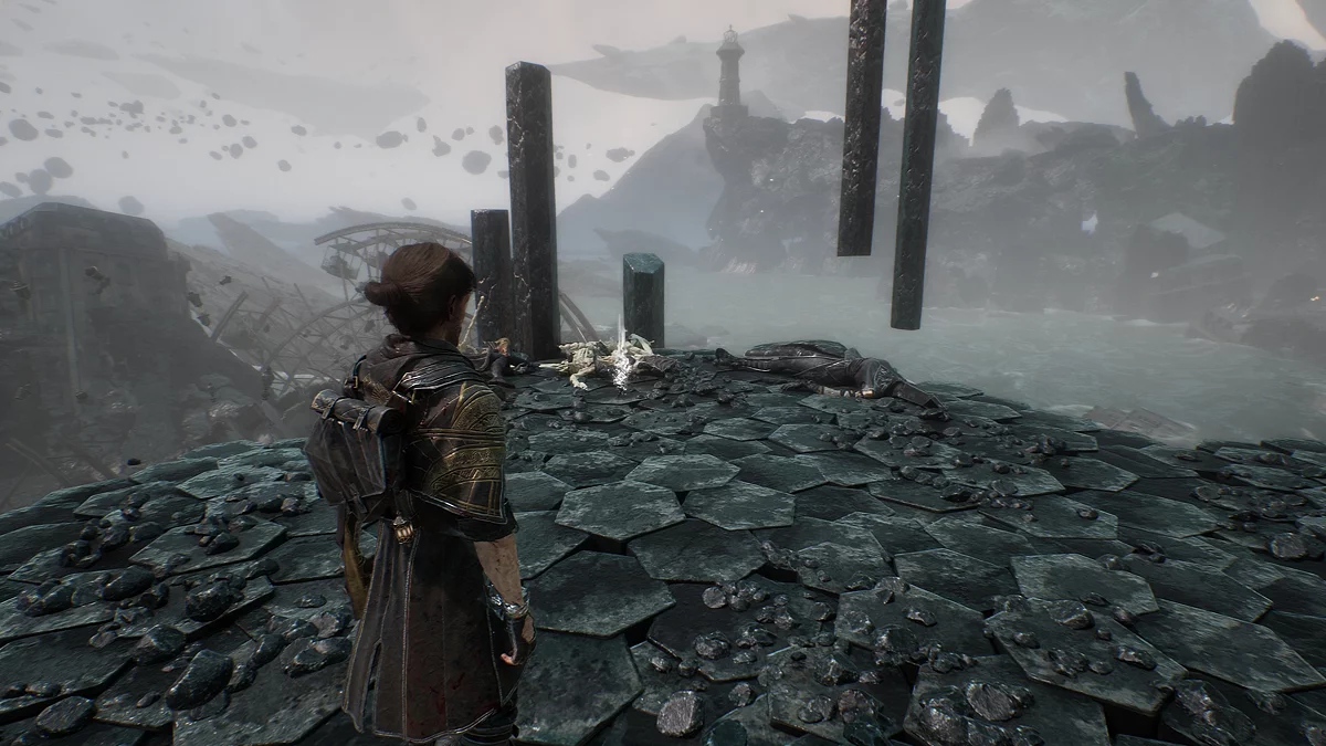 Покиньте локацию через поваленную колонну, по пути соберите журнал и пиктос «Бодрящий старт III».