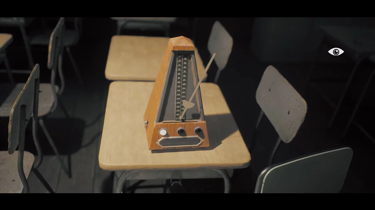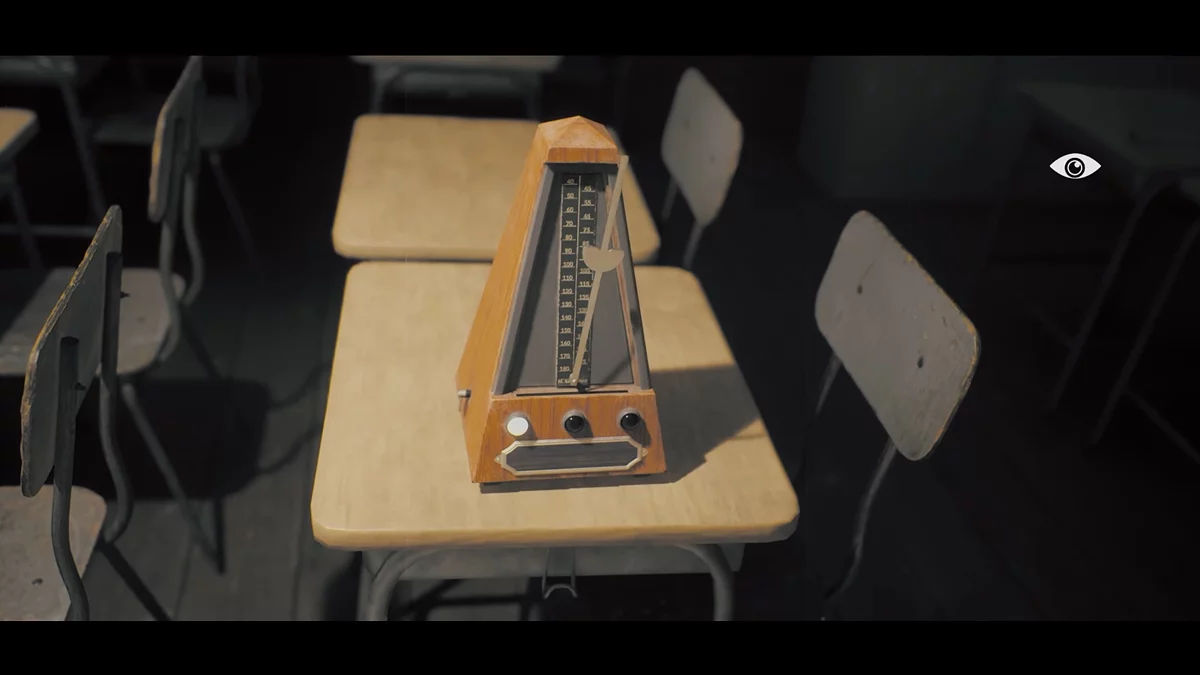 Эта же табличка начнет издавать мелодичные звуки. Нарисованные кружочки обозначают, что это ее мелодичность — первый темп для настройки метронома в кабинете музыки. Выставите значение примерно на 60 единиц. Вторая часть кроется прямо тут: на стене висят часы. Для них установите параметр на отметке 100. Последние часы хранятся в помещении A07 — там их темп достигает до 160 единиц. Таким образом, последовательность следующая: 60, 100, 160. Значения надо воспроизвести последовательно.