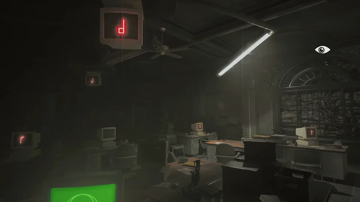 Чтобы выбраться из необычного кошмара, вам потребуется открыть электронный замок двери на первом этаже. Для этого внимательно осмотрите наклейки на компьютерах в офисе второго этажа, а затем по цвету монитора определите нужный дротик и его числовое значение. Расположив всех в порядке скорости передвижения, узнайте правильный ответ — 2535.