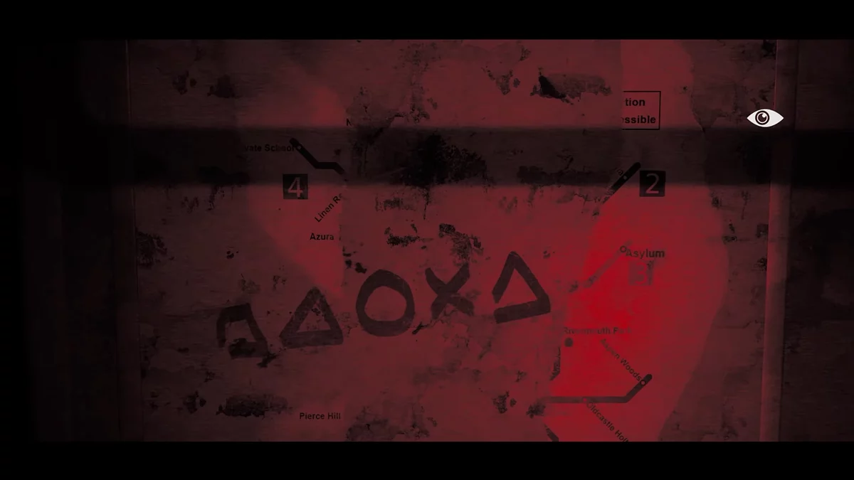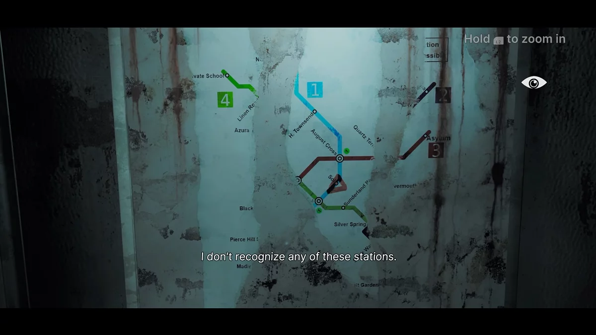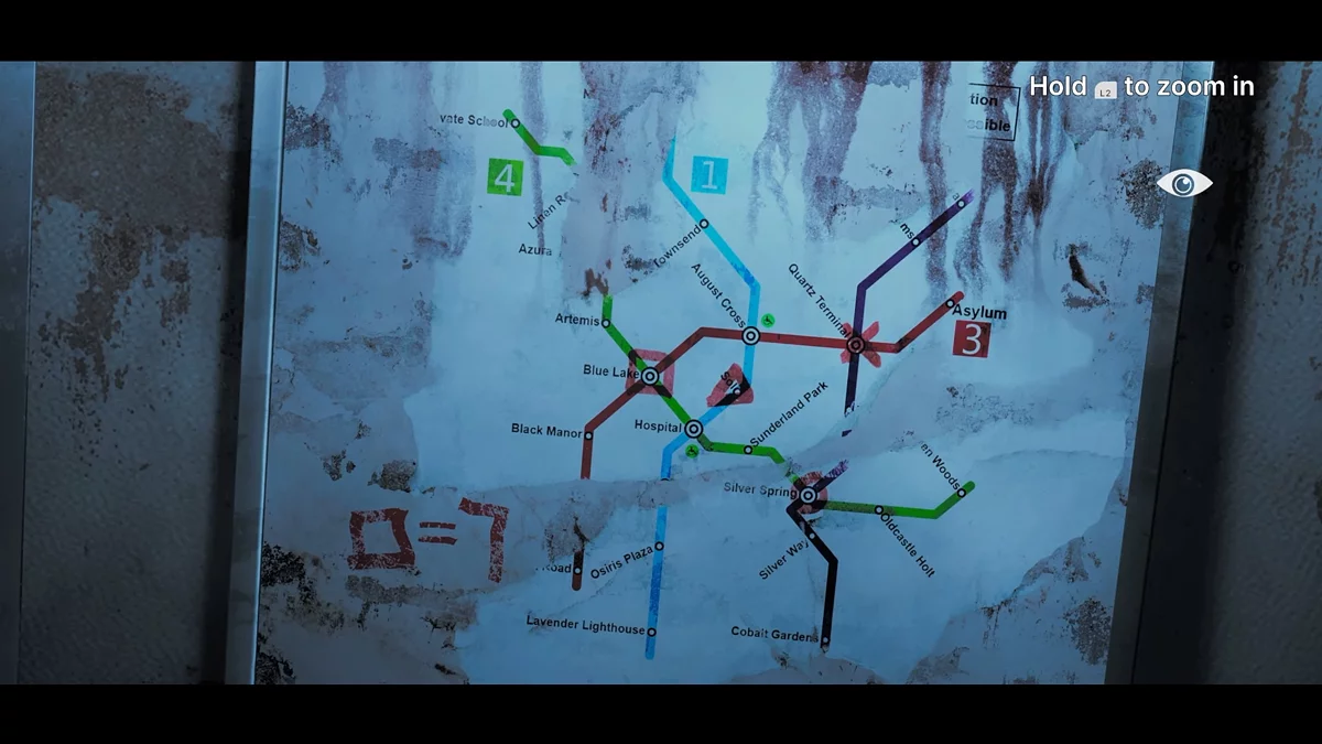 Первый замок появляется в самом начале прохождения: он висит в вагоне поезда, блокируя кабину машиниста. Чтобы узнать код, вам потребуется совместить карты метрополитена и понять значения зашифрованных фигурок. Правильный код — 71651.