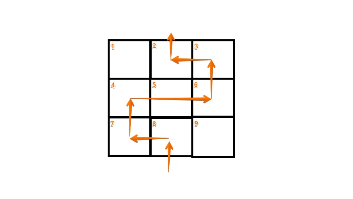- Идите в следующую клетку (4) и перейдите на противоположную сторону (5,6).