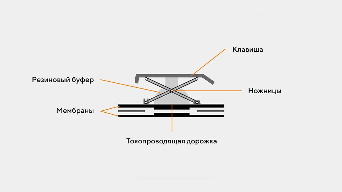 Ножничная клавиатура. Представляет собой ту же мембранную, дополнительно оснащённую рычажным механизмом, напоминающим ножницы. Концы ножниц закреплены в специальных пазах, обеспечивая тем самым равномерное прожимание клавиши по всей площади, независимо от точки давления на кейкап, что также положительно влияет на тактильность. В этом смысле действие ножниц схоже со стабилизаторами для больших клавиш: Enter, Shift и Space. Срок службы продлевается за счет того, что основное воздействие производится именно на ножки, а не на мембрану, которая часто подвергается износу. На указанных клавиатурах срок жизни одной клавиши достигает 10 миллионов нажатий, но и конструкцию немного удорожает. Применяется, очевидно, с кейкапами низкого профиля, что делает высоту клавиатуры заметно тоньше. Отчего встречается в основном в ноутбуках или клавиатурах Apple, но не только там. Несмотря на свою высокую цену, в клавиатурах Apple установлен всё тот же ножничный механизм под мембрану. Бессовестное завышение цены при очевидной экономии. Могли бы использовать механические переключатели Cherry ультранизкого профиля. За что только фанаты яблочников превозносят?