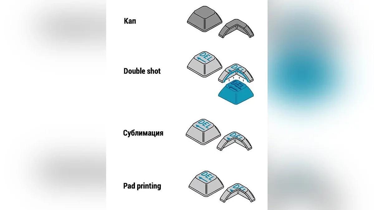 Она же DYE-SUB. Разогретую краску под давлением вгоняют внутрь пустого кейкапа, и получается напечатанная буковка. Эту буковку почти нереально стереть, так как краска не ложится поверх кейкапа, а проникает внутрь пластика и становится единым целым с ним.