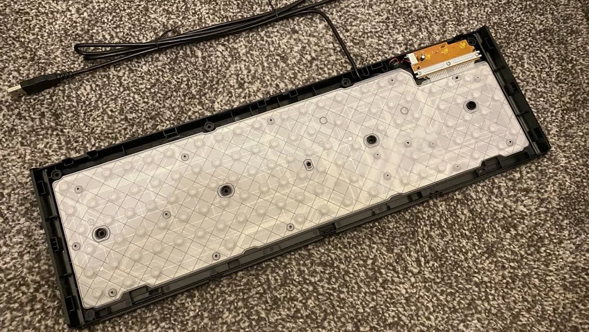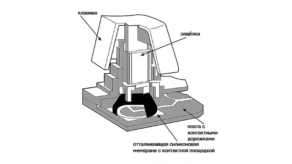 Отвинчиваем корпус, снимаем верхнюю часть с клавишами и видим сплошной мягкий силиконовый слой с выпирающими частями под каждую клавишу — так называемые колпачки, в английской терминологии rubber dome. Под этим слоем лежат ещё три слоя пластиковых листов. Крайние листы замыкают токопроводящие дорожки на контактах при нажатии, средний лист между ними изолирует дорожки крайних листов, предотвращая лишние контактирования, которые не были нажаты в контактах под колпачками. При нажатии мембрана на прожимаемом колпаке соединяется с мембраной на нижнем листе, «точки» на крайних листах замыкают электрическую цепь. Дорожки ведут к контроллеру с тремя светодиодами индикации Num Lock, Scroll Lock, Caps Lock. Это его мы видим в Диспетчере Устройств Windows под именем Клавиатура HID (Human Interface Device). По мере износа кейкапов, мембран и контактов клавиатура постепенно приходит в негодность и в силу своей низкой стоимости не подлежит никакому ремонту. Ресурс составляет в среднем от 5 до 10 миллионов нажатий.