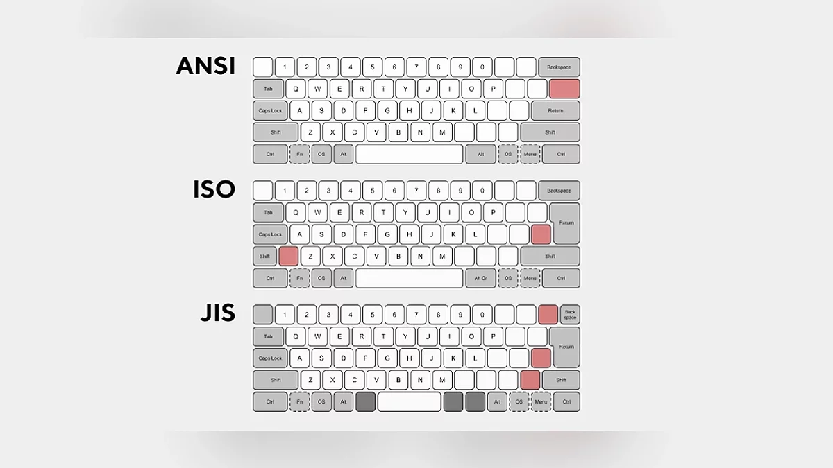 Между раскладками ANSI (American National Standards Institute) и ISO (International Organization for Standardization) есть пять заметных различий, которые заключаются в форме и расположении клавиш Enter, правого Alt, левого Shift и «бэкслэша», а также в общем количестве клавиш на клавиатуре. С первого взгляда кажется, что различия в двух раскладках небольшие, но если вы уже долгое время работаете за одной, местами может стать немного непривычно.