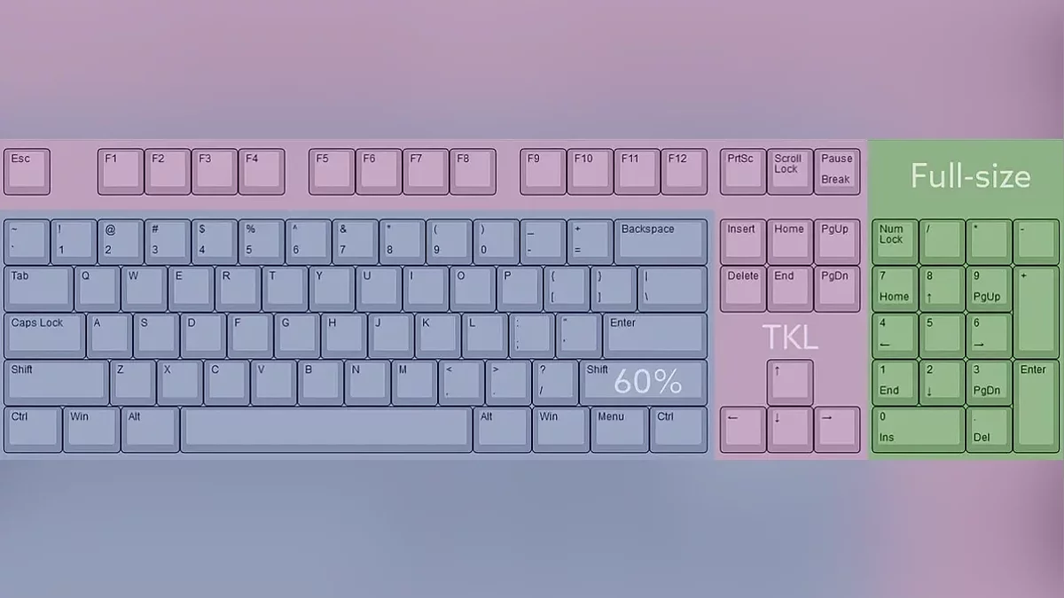 Клавиатуры 60-65%. 60% — компактные клавиатуры. У них нет функциональных клавиш F1-F12, убраны цифровой блок, стрелки и блок системных команд. Всё это заменяется на нажатия комбинаций. Размер 65% отличается от 60% наличием стрелок и еще двух-трех клавиш системных команд.