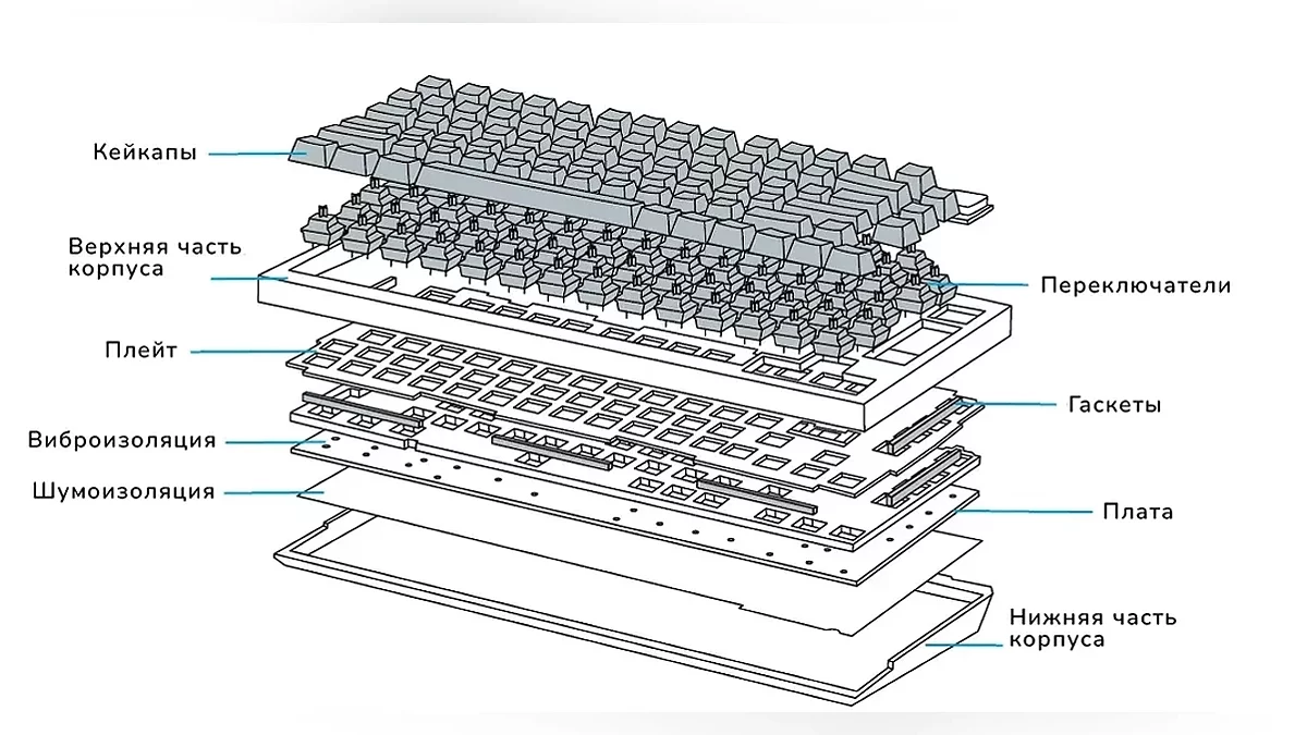 Чаще всего виброизоляцию делают из материала по типу силикона и помещают между платой и плейтом. А шумоизоляцию делают из более пористого материала и кладут в корпус. Однако каждый производитель может менять как количество таких слоев, так и их состав и расположение. Называться эти слои могут также по-разному в зависимости от материала, но на схемах обычно они идут с приставкой «foam». Например, PORON Plate foam, где Poron — название материала.