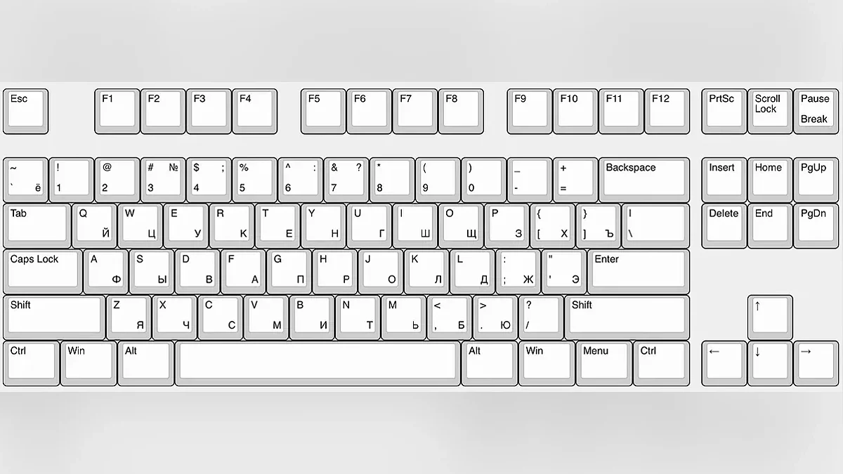 Клавиатура 75%. Чуть более компактный формат, чем 80%. Клавиши в нем расположены плотно, без свободного пространства — стрелки и системные команды (ScrLock, NumLock, Pause/Break) перенесены ближе и вертикально в основной блок.