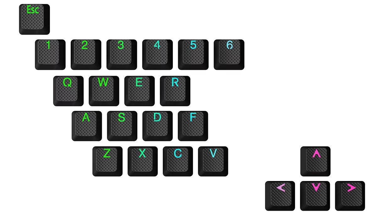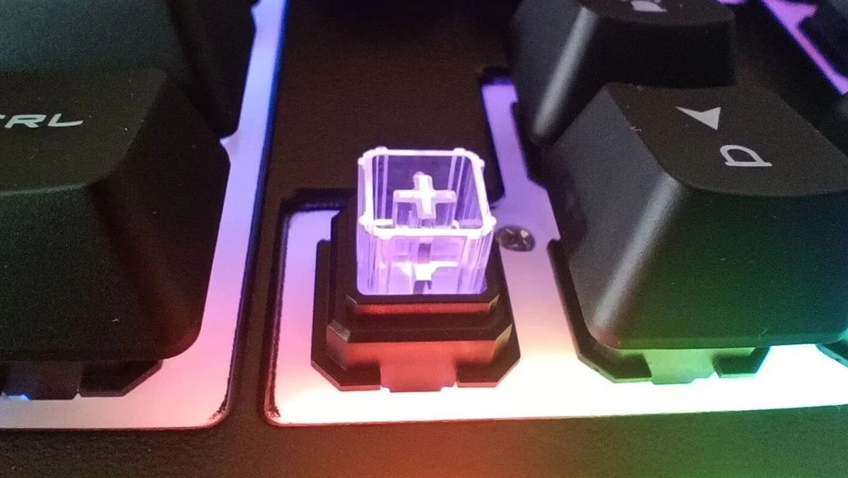 Кейкапы или клавиши. Колпачки с символами (или без), которые надеваются на переключатели. По факту это небольшие кусочки пластика (или прочего материала) с креплением с обратной стороны.