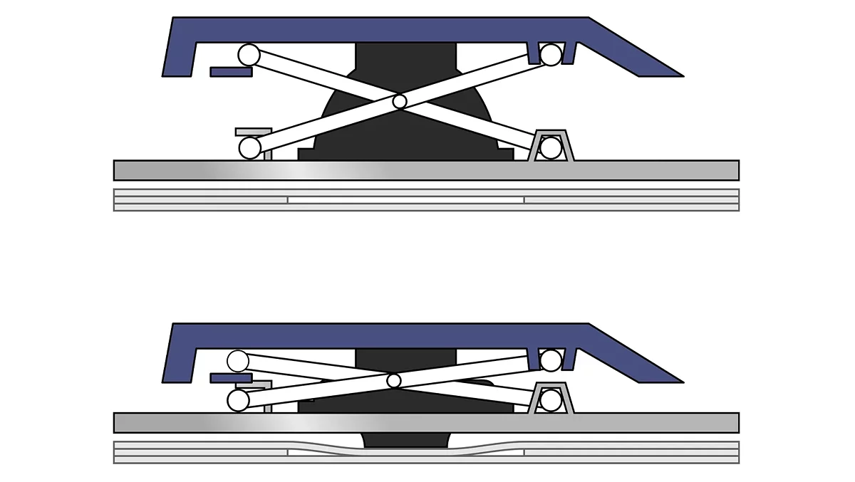 Плунжерная клавиатура. Чтобы усилить тактильный отклик, на некоторые модели поверх мембраны устанавливают специальные плунжеры, которые служат переходником между кейкапом и силиконовой кнопкой. Плунжер представляет собой крестовидный стержень, который перемещается вверх-вниз внутри пластикового корпуса. Нижняя часть плунжера контактирует с мембраной, а верхняя поддерживает кейкап.