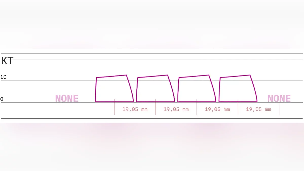 Профиль самой клавиатуры и ее платы — прямой, а кейкапы уже сделаны с учетом эргономики. Ряды отличаются между собой и имеют различный угол наклона. Минус такого профиля — невозможность установить нестандартную раскладку и просто перекинуть капы, не потеряв в форме и эргономике.