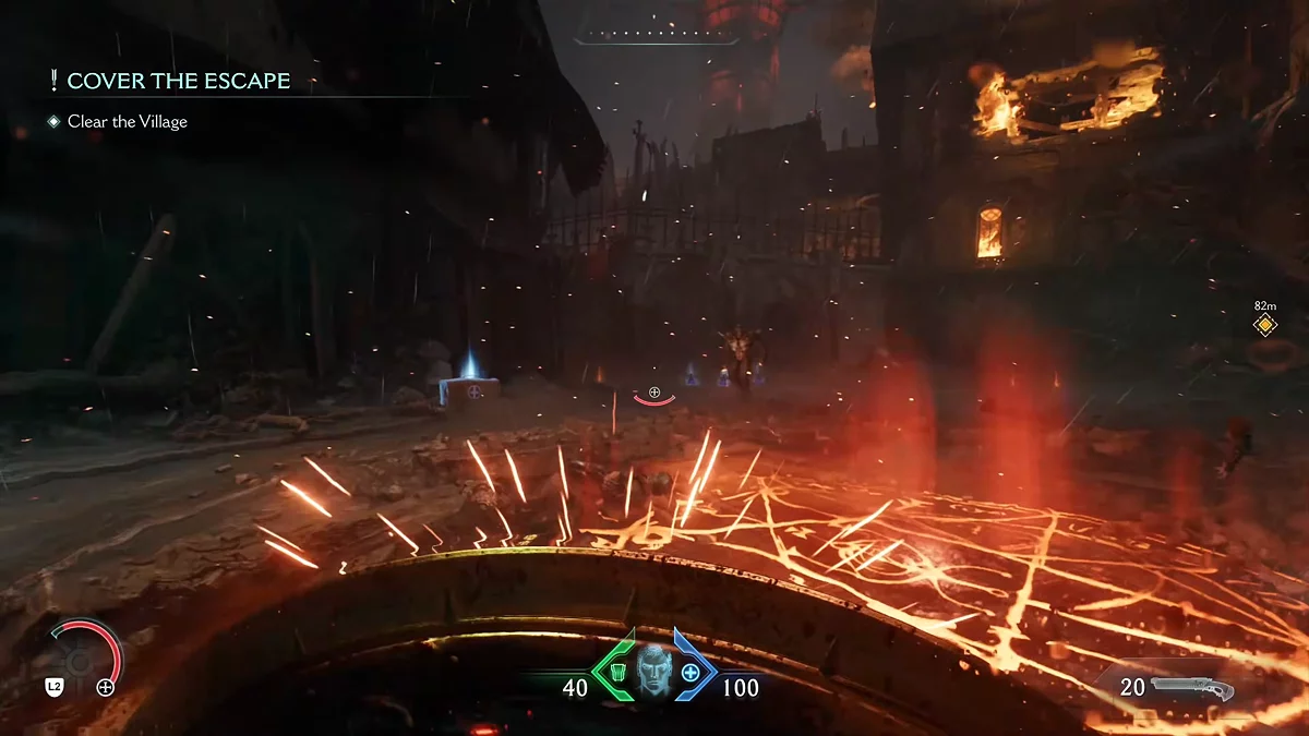 Теперь вам нужно найти ключ от двери с синим замком. Следуйте за маркером в следующую часть деревни. По пути вы встретите ещё одну дверь с синим замком — мы вернёмся к ней позже. Добравшись до арены, уничтожьте противников, появляющихся через щель в полу. Используйте удар щитом, чтобы разрушить деревянную преграду. Пройдите через горящее здание, уничтожьте башню с зелёными снарядами. Продолжайте движение вперёд и поднимитесь по стене. На этом этапе вам нужно научиться парировать снаряды.
