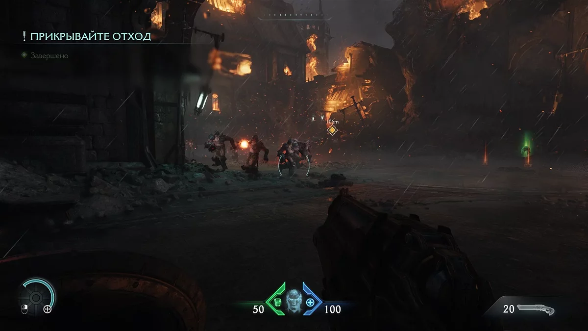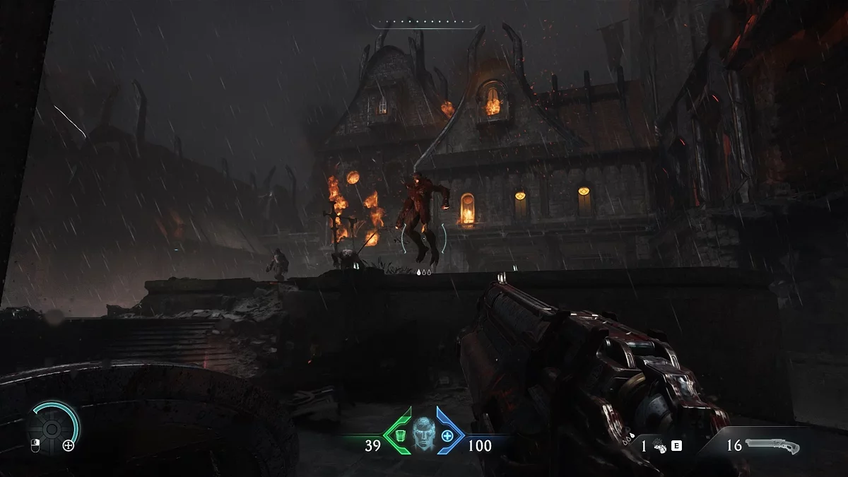 После убийства Импа барьер исчезнет с дверного проёма. Пройдите через горящее здание и поднимитесь по стене. Откройте контейнер, чтобы получить силовую перчатку. Продолжайте движение вперёд, используя новое оружие против демонов — это позволит пополнить боеприпасы. Освойте трёхударное комбо против импов, чтобы завершить обучение и разблокировать дверь. Войдите в здание, уничтожьте импов, но не поднимайтесь на стену — рядом находится секрет.