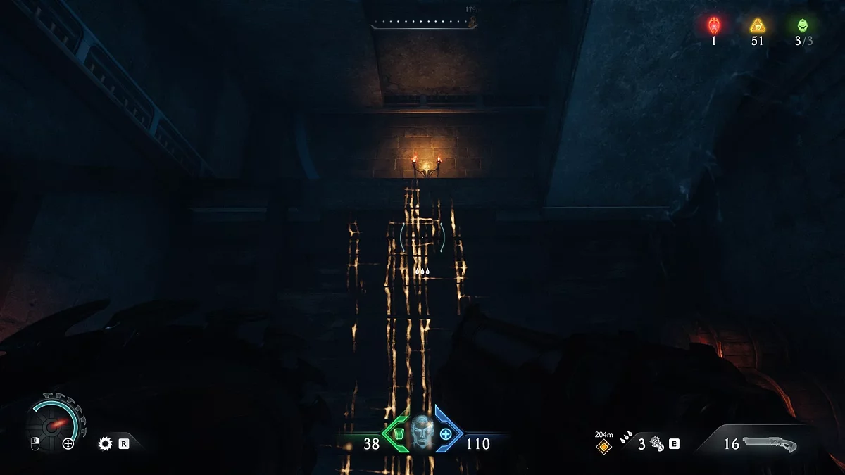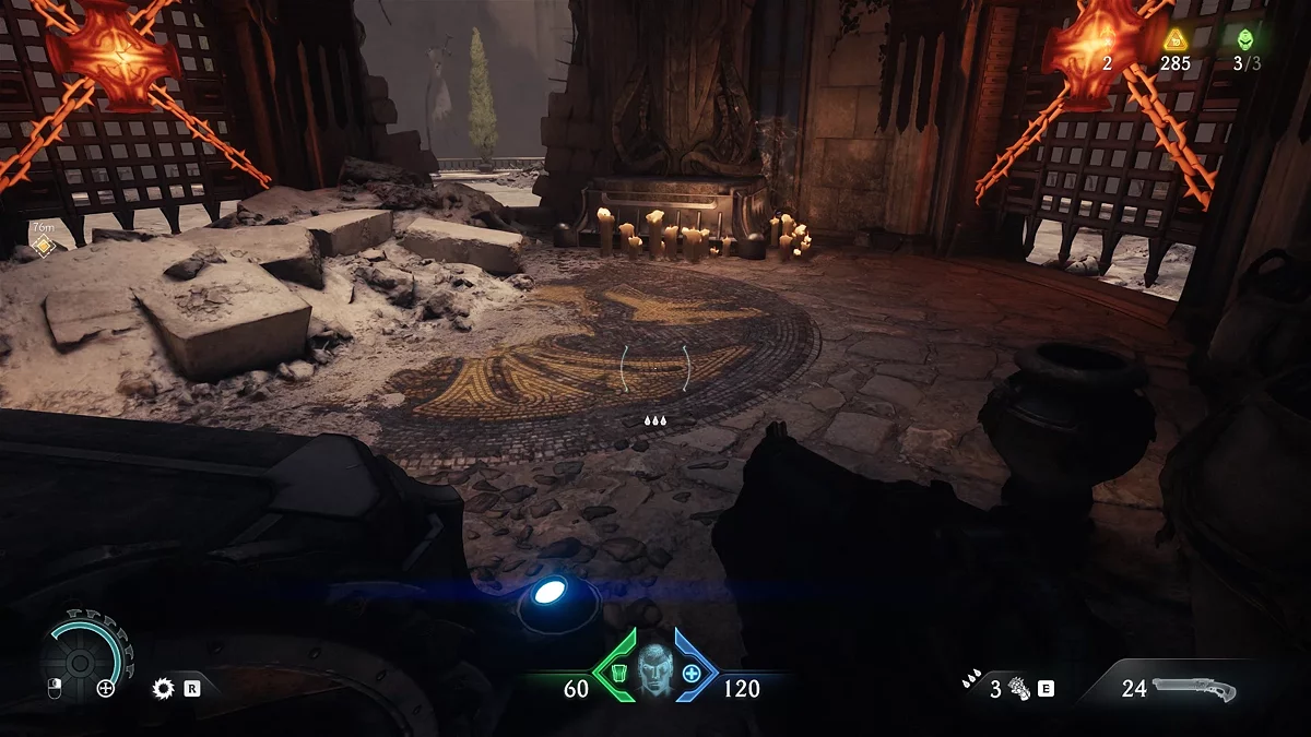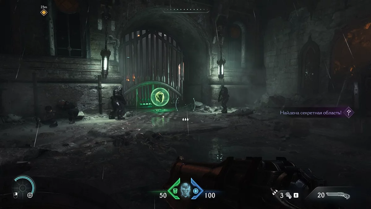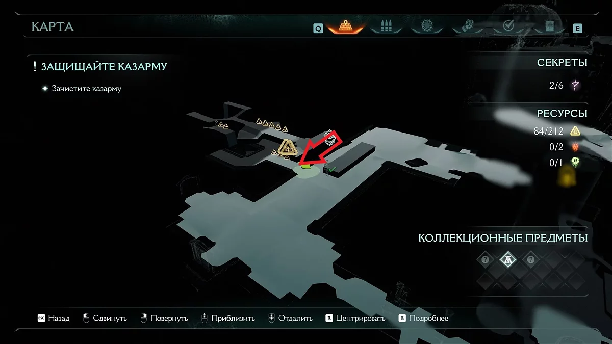 Первый тайник с золотом вы получите после нахождения нового оружия. На карте вы увидите проход, ведущий в наружную часть здания. Соберите золото на лестнице, ведущей вниз. В самом низу вы увидите дверь, запертую воротами. За ними вы сможете разглядеть коллекционный предмет. Заберём его чуть позже. Поднимитесь по лестнице и войдите в дверь с сюжетным маркером. Уничтожьте противников и Манкубуса. Прежде чем идти дальше по коридору, остановитесь.
