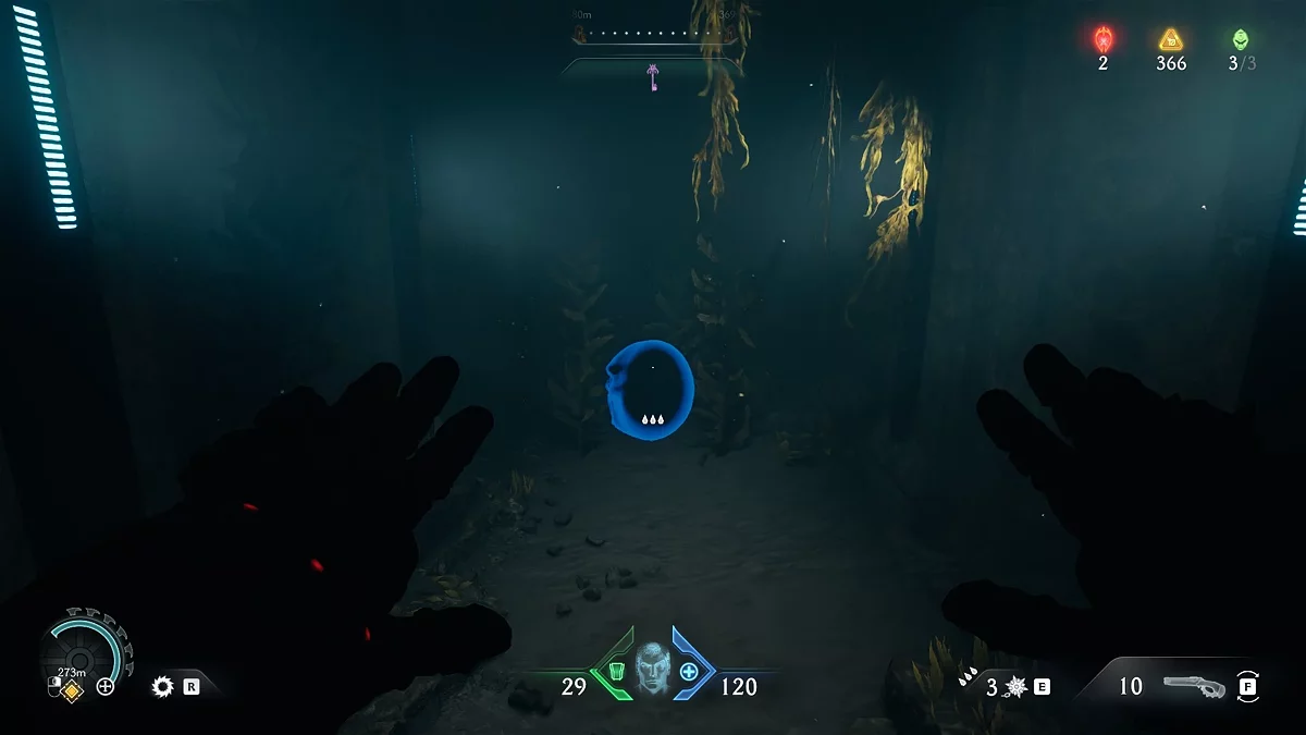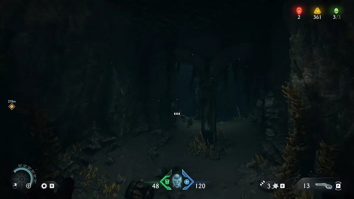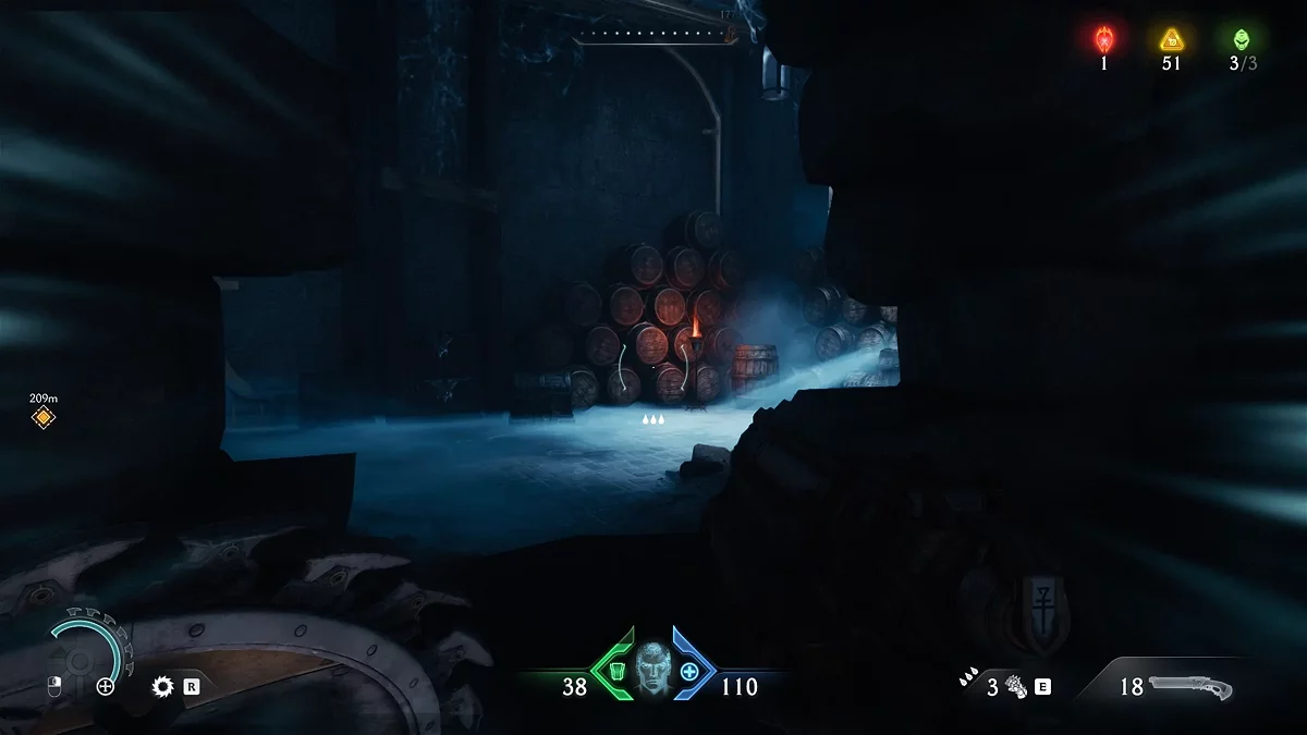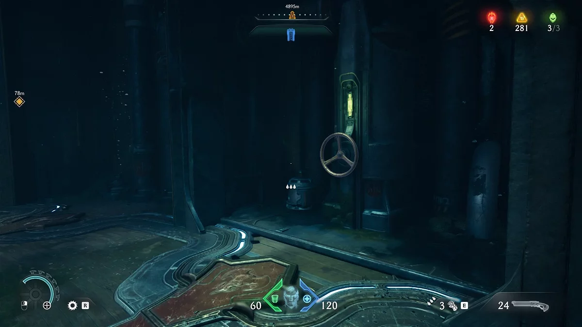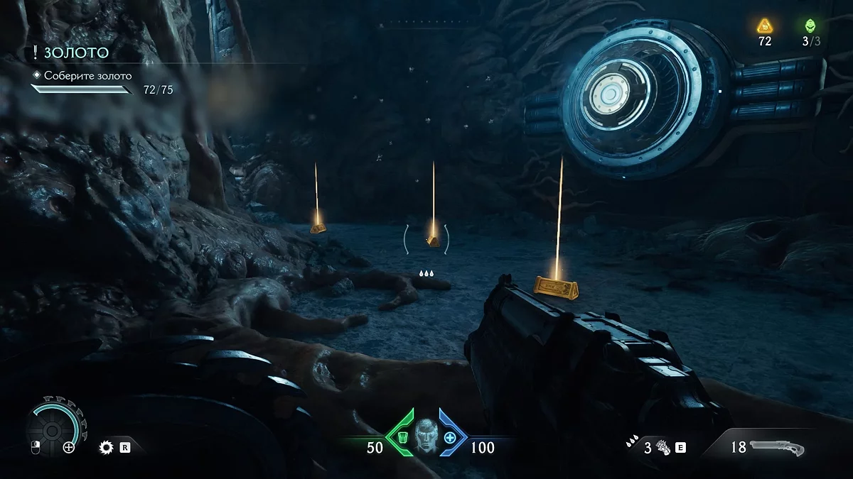 Первый тайник с золотом вы получите после нахождения нового оружия. На карте вы увидите проход, ведущий в наружную часть здания. Соберите золото на лестнице, ведущей вниз. В самом низу вы увидите дверь, запертую воротами. За ними вы сможете разглядеть коллекционный предмет. Заберём его чуть позже. Поднимитесь по лестнице и войдите в дверь с сюжетным маркером. Уничтожьте противников и Манкубуса. Прежде чем идти дальше по коридору, остановитесь.