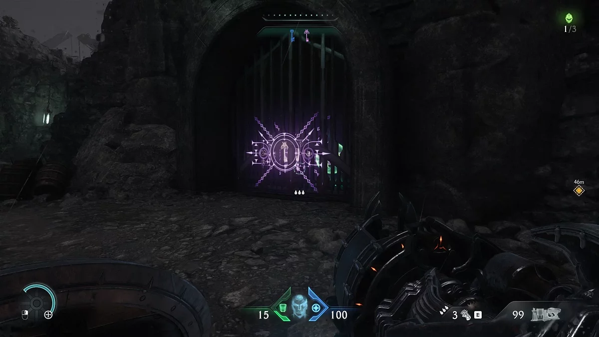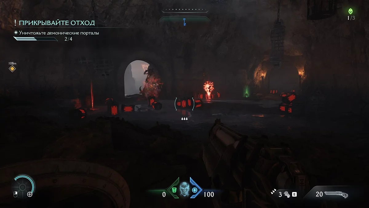 Теперь нужно закрыть второй портал в следующей области. Откройте карту, чтобы увидеть путь к нему. На новой арене также потребуется уничтожить всех демонов. Будьте осторожны с противниками, вооружёнными щитами. После победы откройте карту и найдите значок кисти под ареной — это обозначение коллекционного скина. Пока оставьте его и следуйте за забор, где находится голограмма ключа. Пройдите через туннель в новую зону и возьмите дополнительную жизнь.