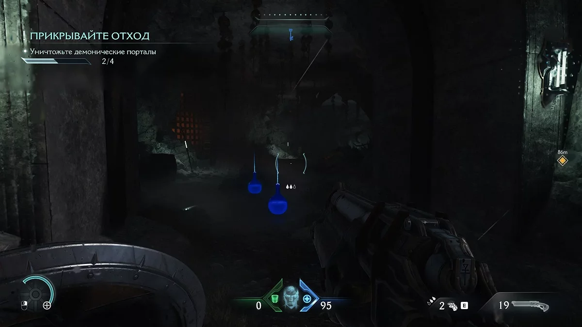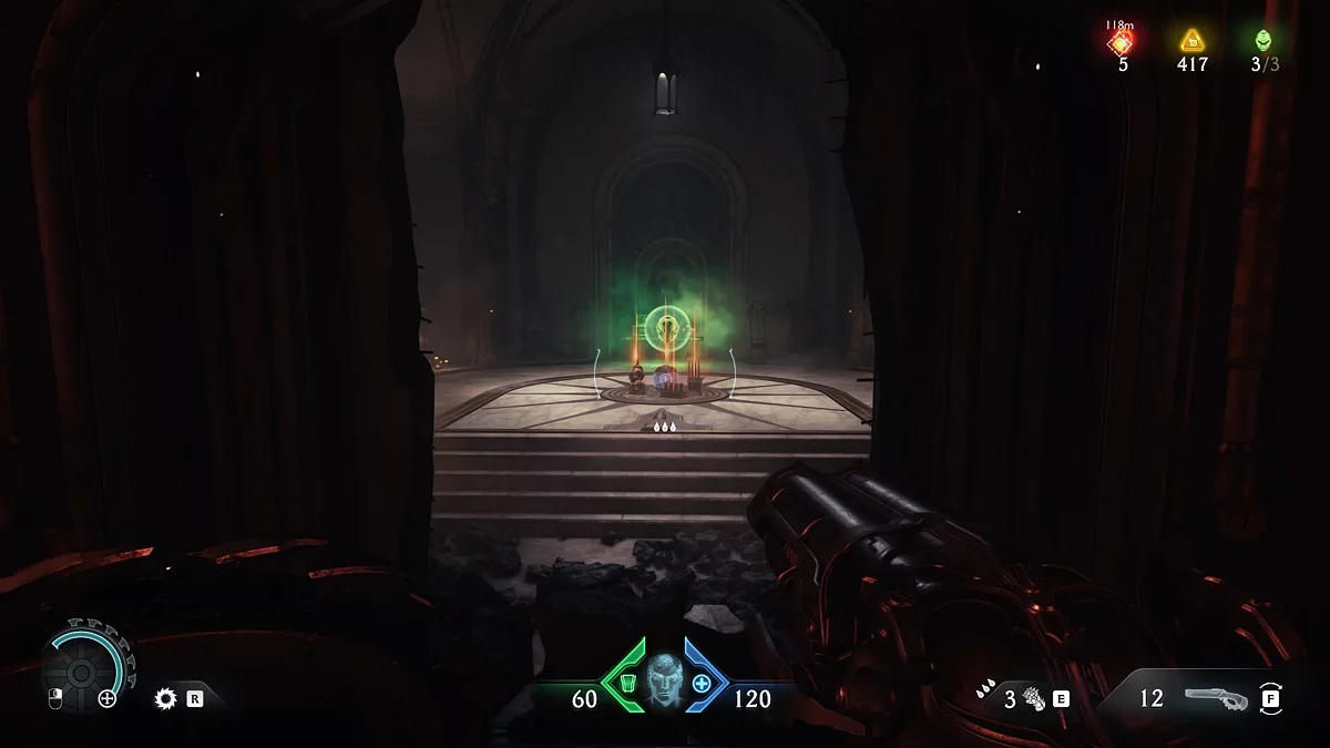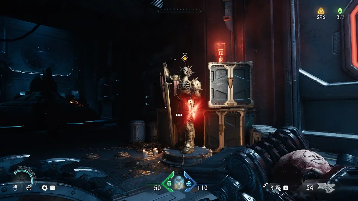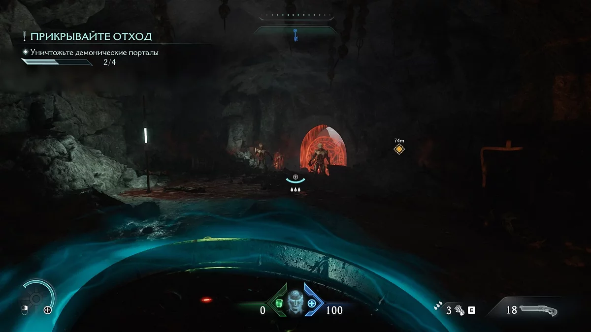 После убийства всех противников разблокируется поле, которое даст доступ к новому оружию. Теперь вам нужно найти источник демонической порчи. Идите дальше по маркеру, уничтожая противников. Дойдя до голограммы с головой, остановитесь.