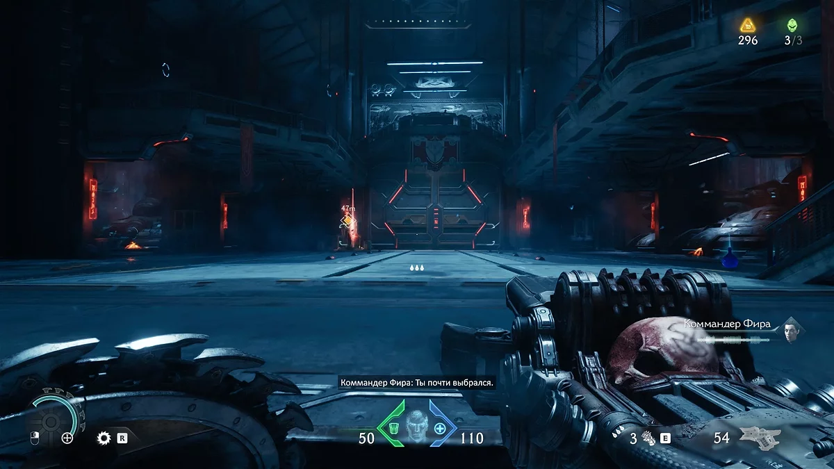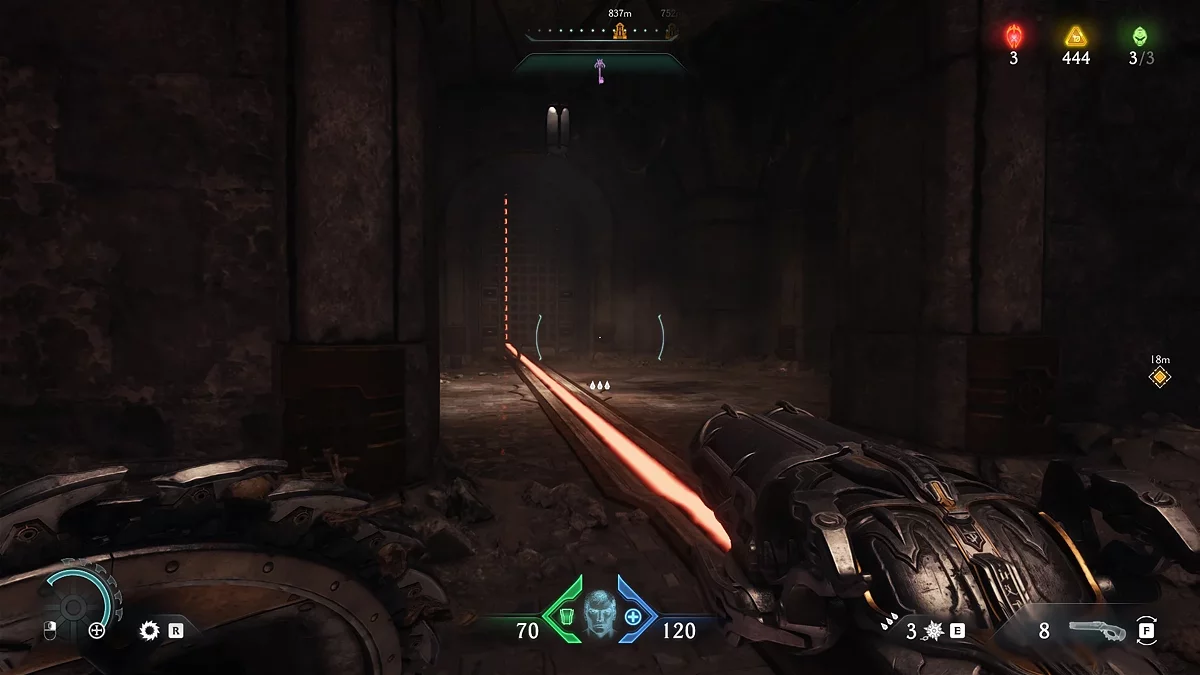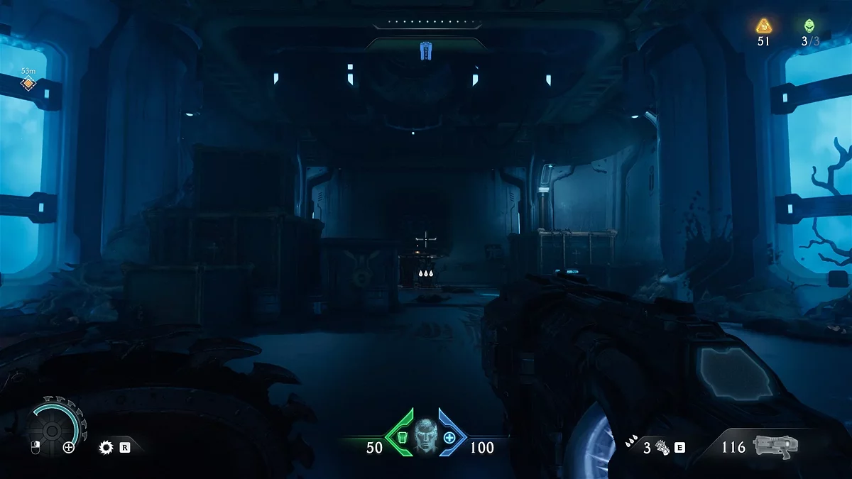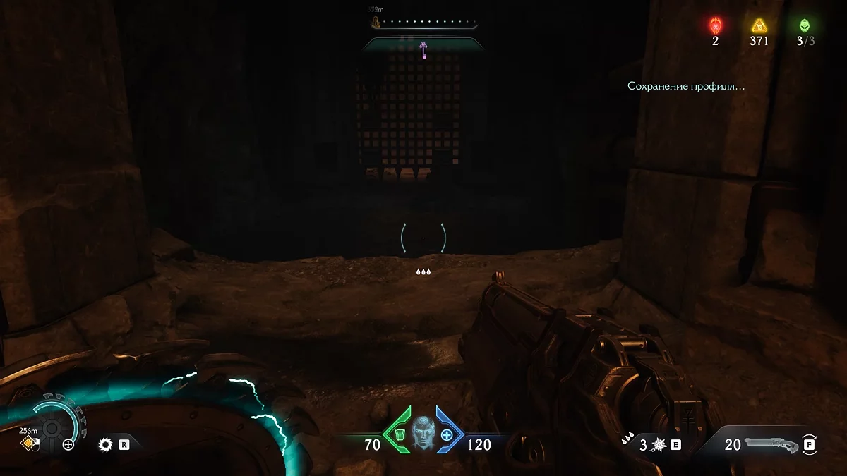 После убийства всех противников разблокируется поле, которое даст доступ к новому оружию. Теперь вам нужно найти источник демонической порчи. Идите дальше по маркеру, уничтожая противников. Дойдя до голограммы с головой, остановитесь.