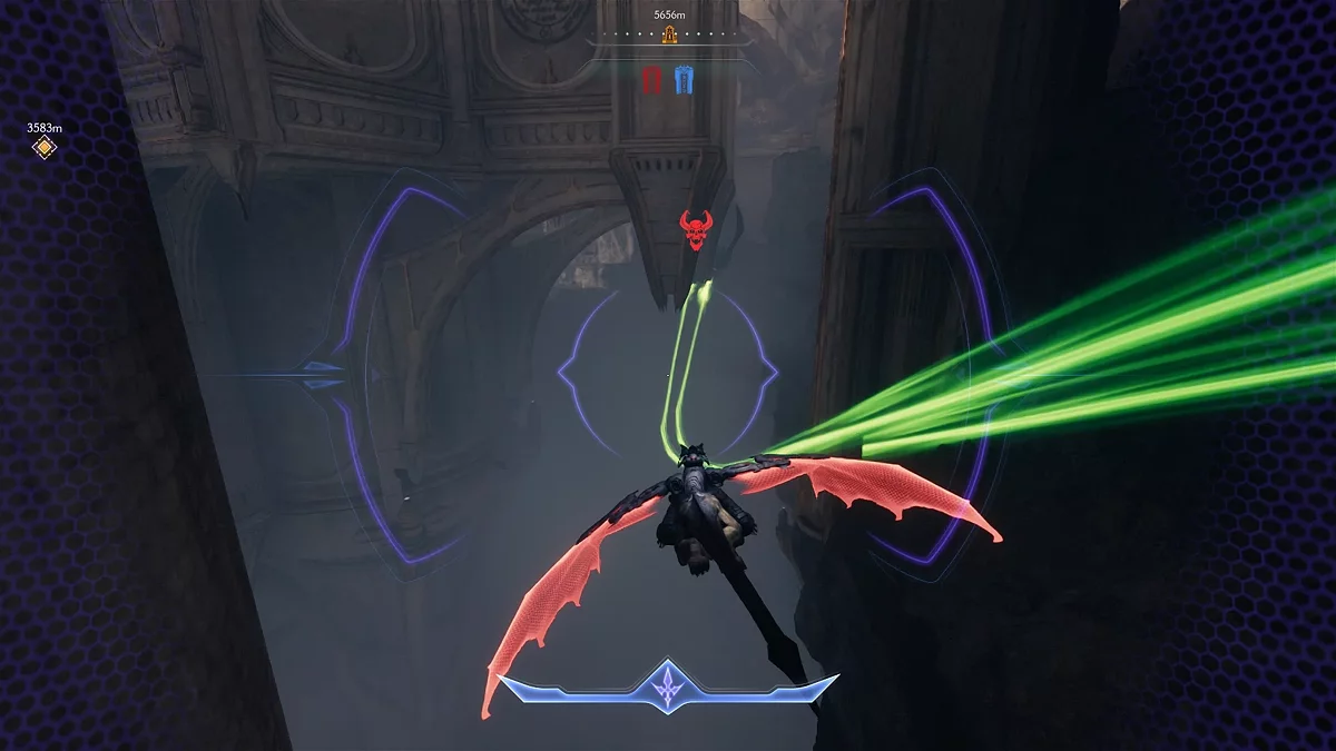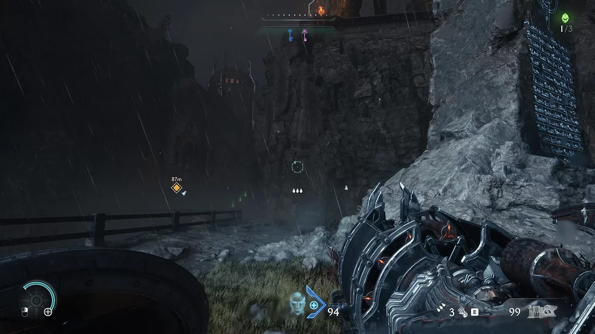 Вернитесь к скале и взберитесь по стене на арену. Поверните налево и поднимитесь на скалу. На развилке сверните налево, уничтожьте всех противников на вершине, чтобы закрыть третий портал. Перед уничтожением последнего портала найдите секретный ключ. Обойдите кран справа и запрыгните на платформу, где лежит ключ для фиолетовой комнаты.