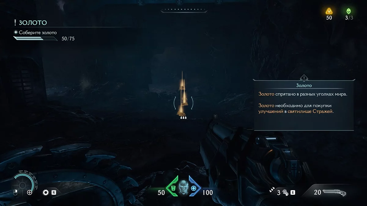 Золото учитывается в 100%-м прохождении. За него вы можете улучшить своё оружие и способности, поэтому тщательно собирайте его. В данный момент вы сможете найти 75 единиц золота. Откройте тайник и соберите валюту вокруг. Затем воспользуйтесь святилищем, чтобы улучшить своё снаряжение. Не забудьте забрать три золотых слитка, которые лежат за святилищем.