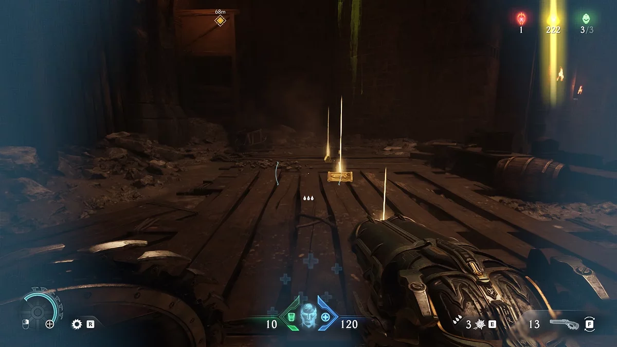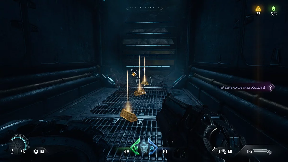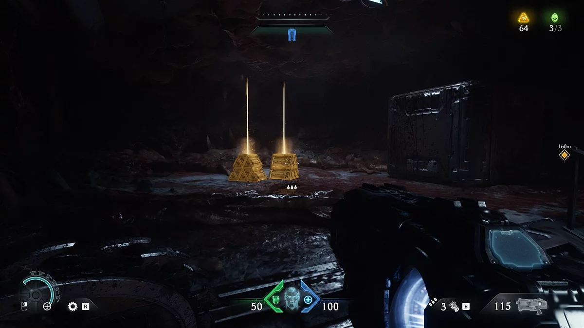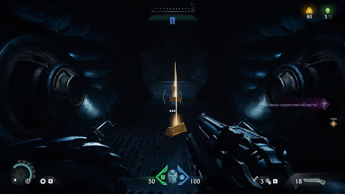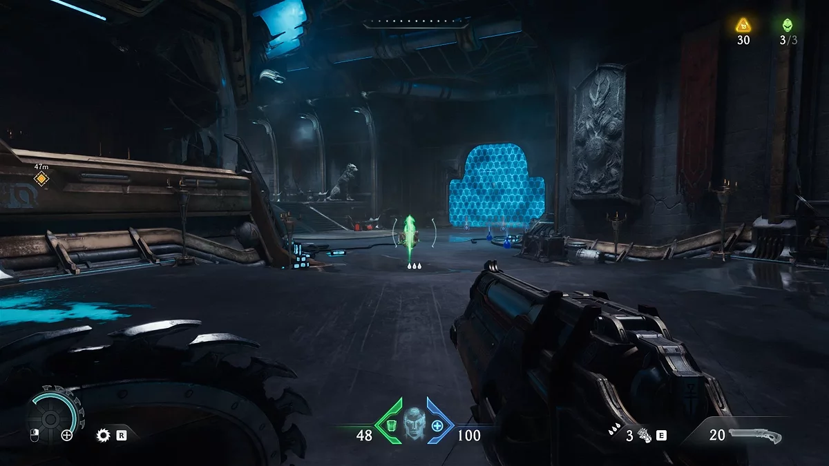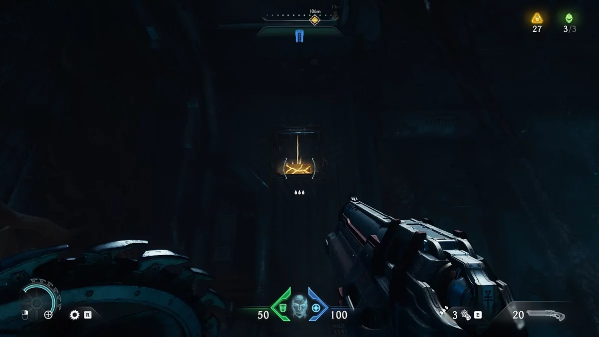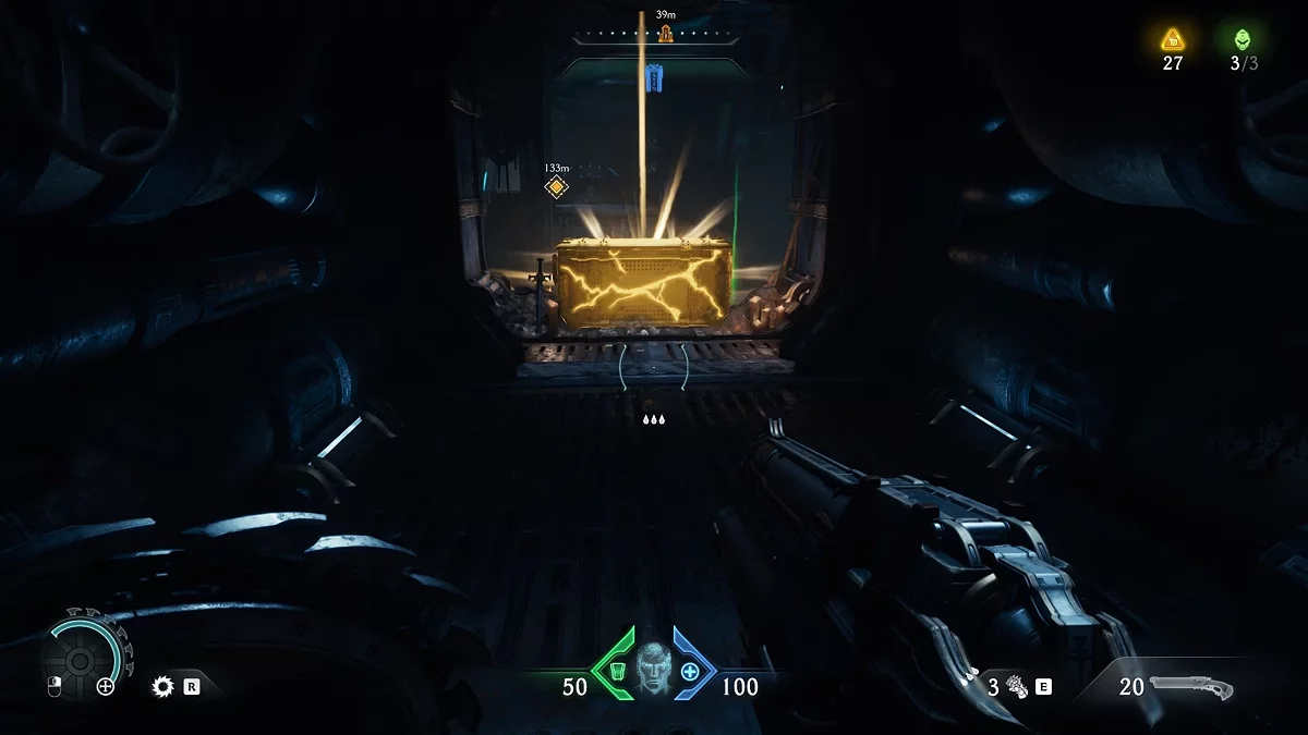 Идите обратно к голограмме, а затем к лифту с красным замком. Воспользуйтесь щитом, чтобы разбить замок. Поднимитесь по стене. Пройдите по вентиляции и остановитесь на развилке. Дождитесь выстрела турели зелёным снарядом, чтобы отбить его щитом. За тлеющими останками вы увидите золотые слитки. На данный момент у вас должно быть 114/210 единиц валюты. Если меньше, вернитесь и соберите остальные слитки.