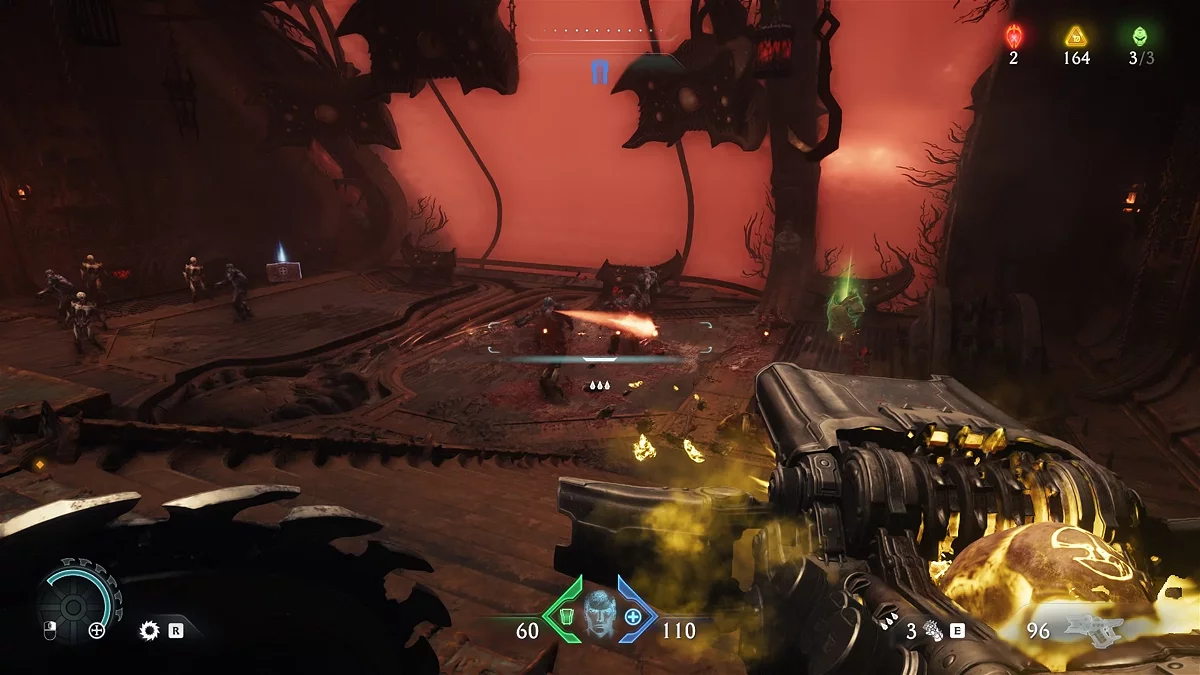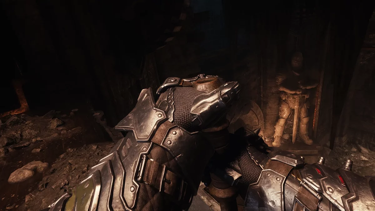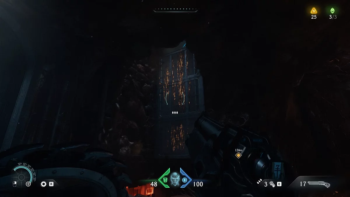 Спрыгните с платформы и идите в проход, освещённый зелёными огнями. Слева вы увидите коробки, скрывающие коллекционный предмет, а справа будет металлический замок, который можно разбить щитовой пилой для продвижения по сюжету. Обойдите коробки и заберите страницу из кодекса. Вернитесь обратно к замку и сломайте его. Идите по коридору и поднимитесь вверх по стене. Выберитесь наружу и сразитесь с рыцарем ада. Уничтожив монстра, идите по маркеру в исследовательскую лабораторию.