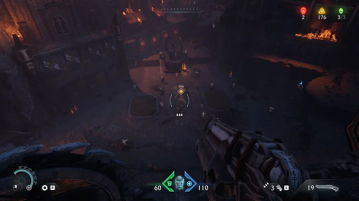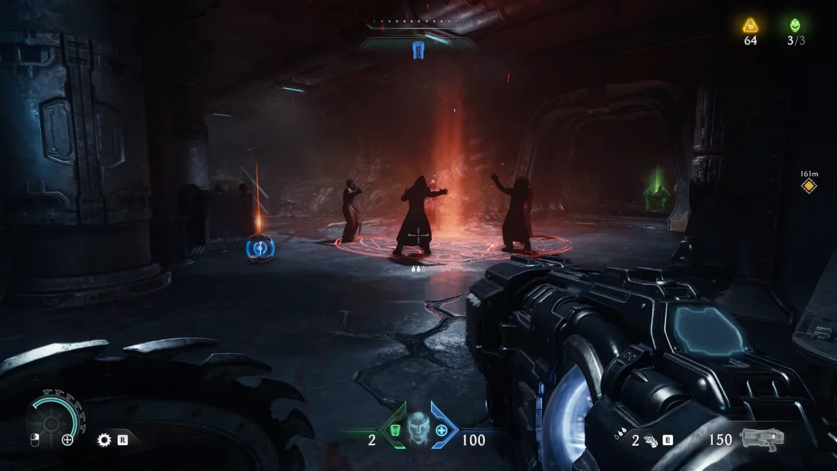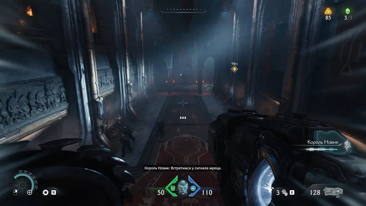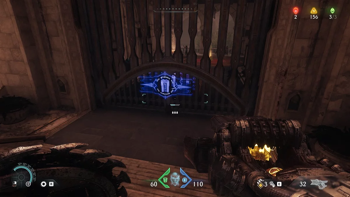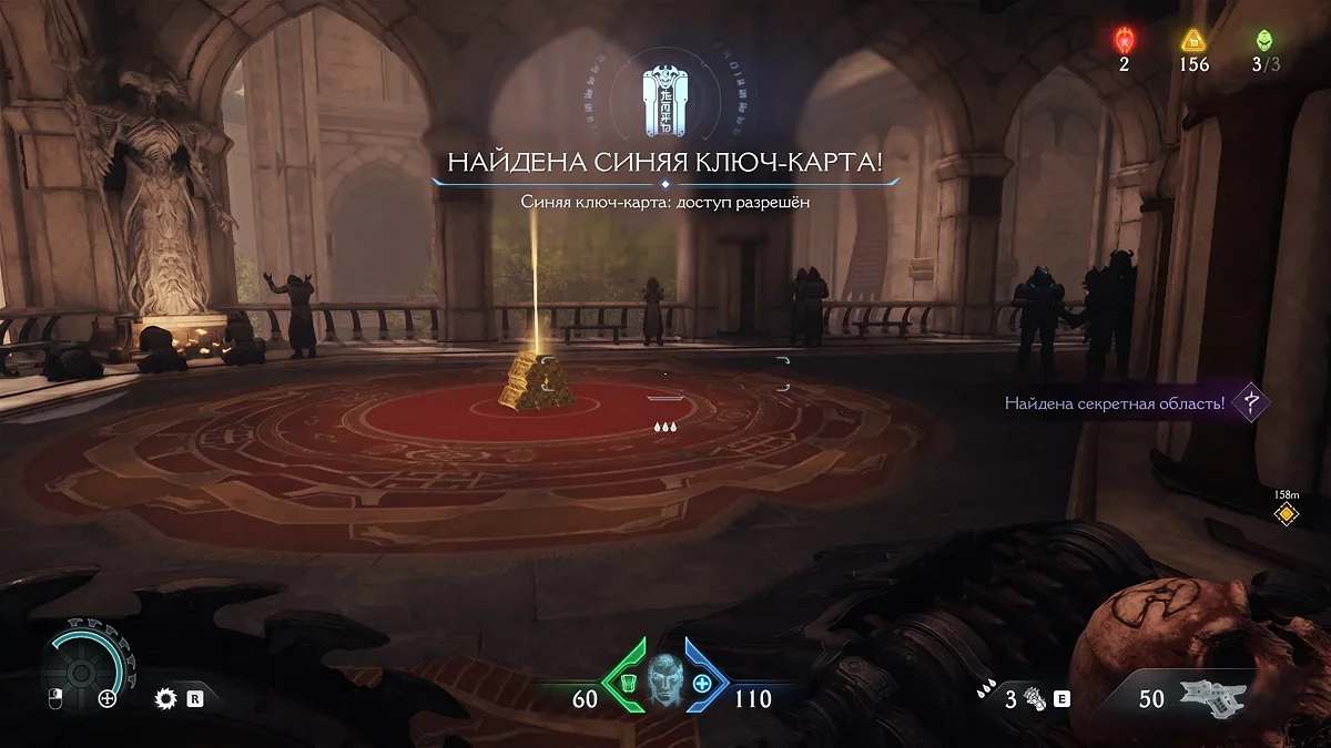 После зачистки арены переместитесь в следующую зону. Опробуйте новую атаку на Пинки. Войдите в церковь, где увидите группу безвредных культистов — их можно не трогать. Подойдите к телу у статуи и возьмите синий ключ.