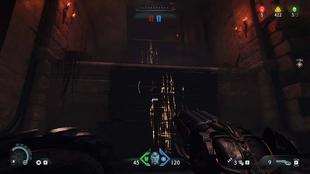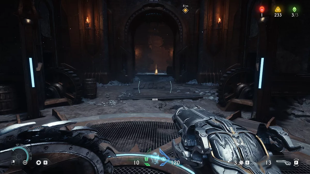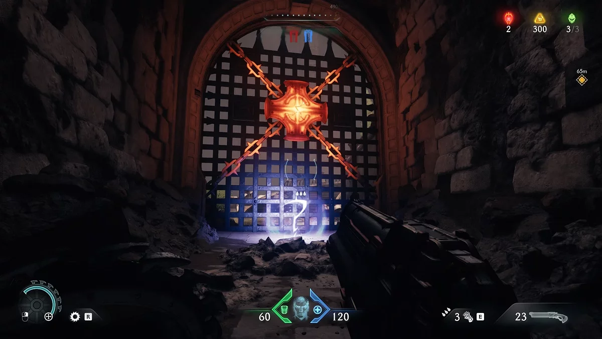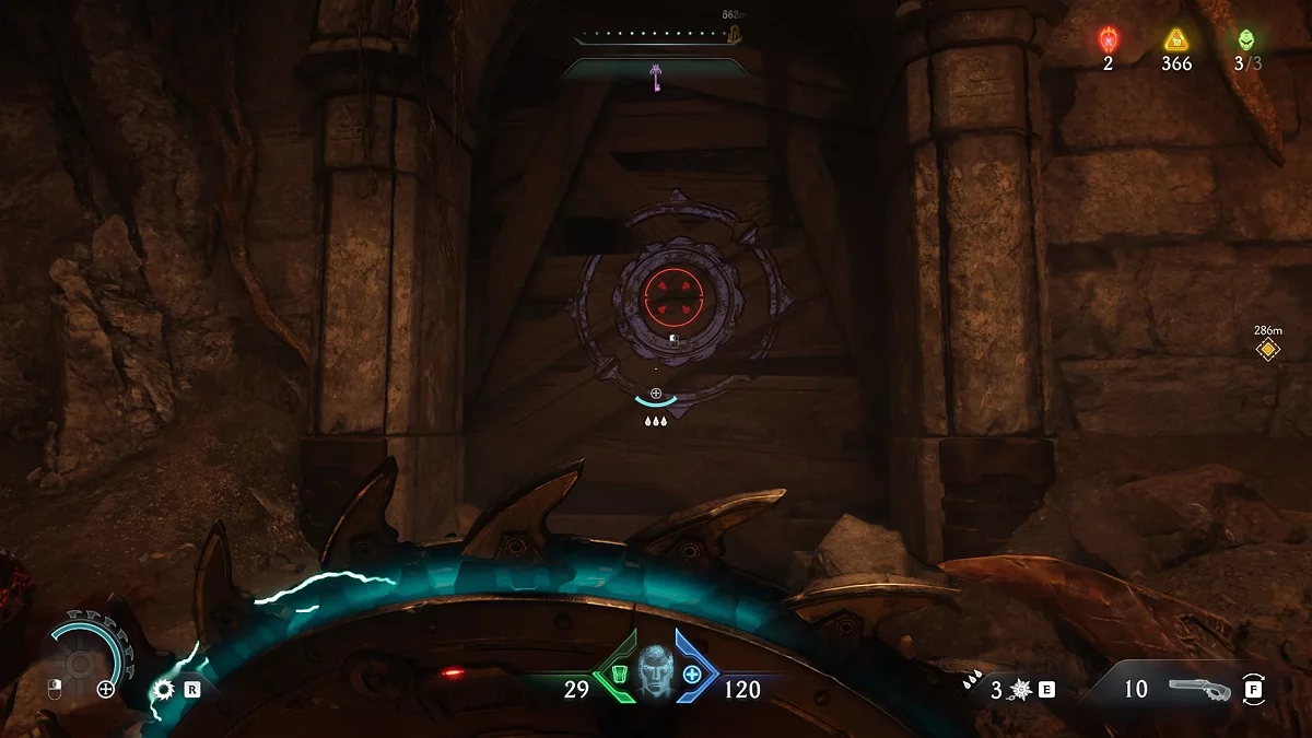 Проломите каменную стену в коридоре за ареной. За ней находится синий переключатель. Активируйте его щитом.