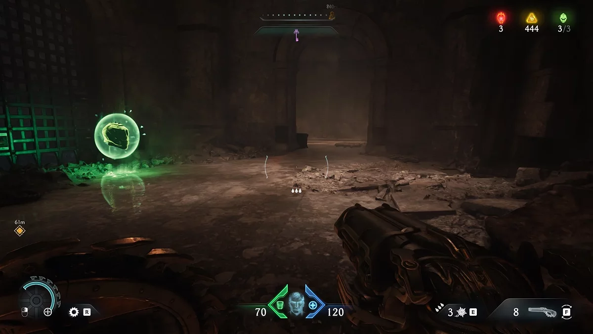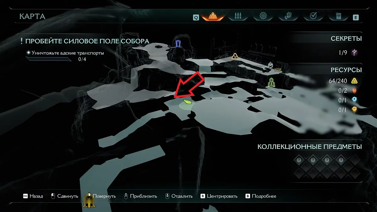 Вернитесь к пролому и взберитесь по стене. Разрушьте дверь щитом и продолжайте движение через точку невозврата — особую зону, блокирующую доступ к предыдущим участкам уровня. На карте такие зоны отмечены большой стрелкой.