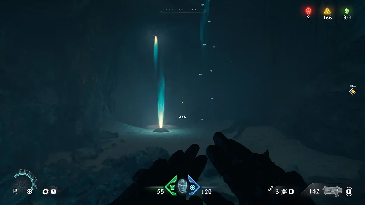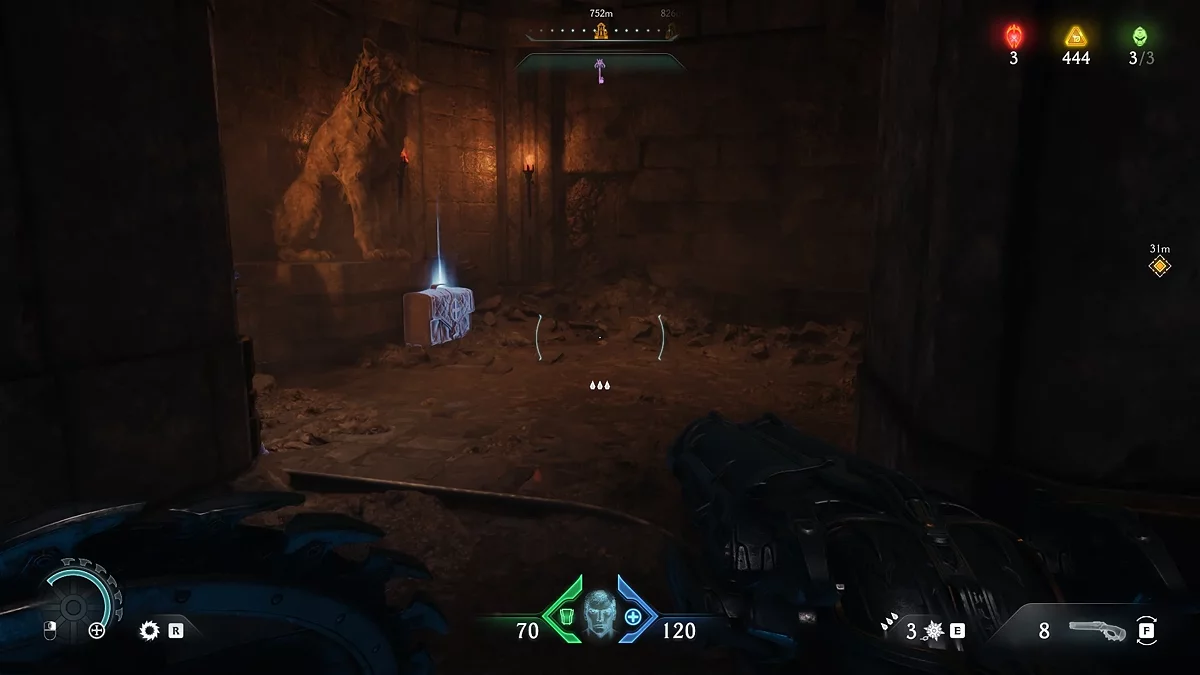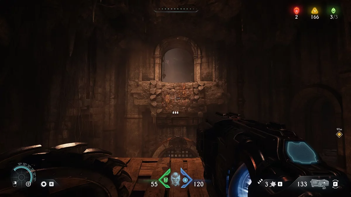 Слева от двери, ведущей из казармы, находится статуя, держащая первый рубин. Заберите ресурс. С помощью него вы можете улучшать снаряжение в святилище. Как только вы возьмёте камень, откроется дверь. Спрыгните вниз и идите к десантной капсуле. Возьмите новое оружие. Перебейте монстров и ступайте к святилищу. Улучшите снаряжение по собственному желанию.