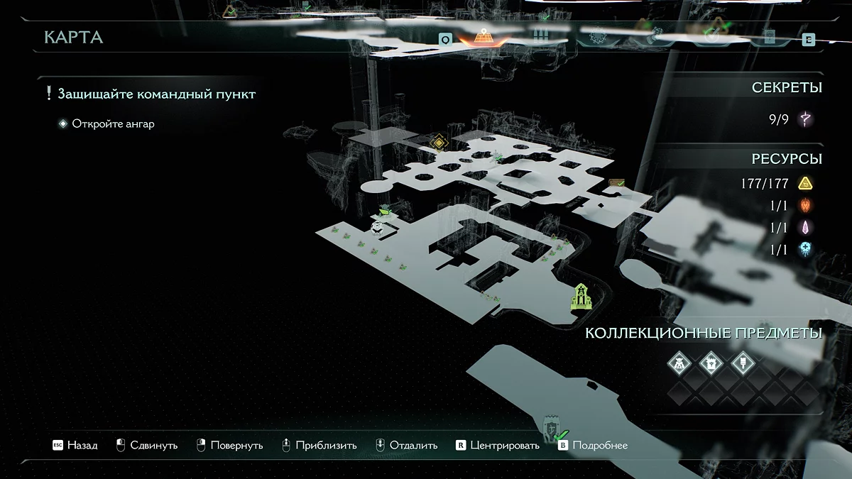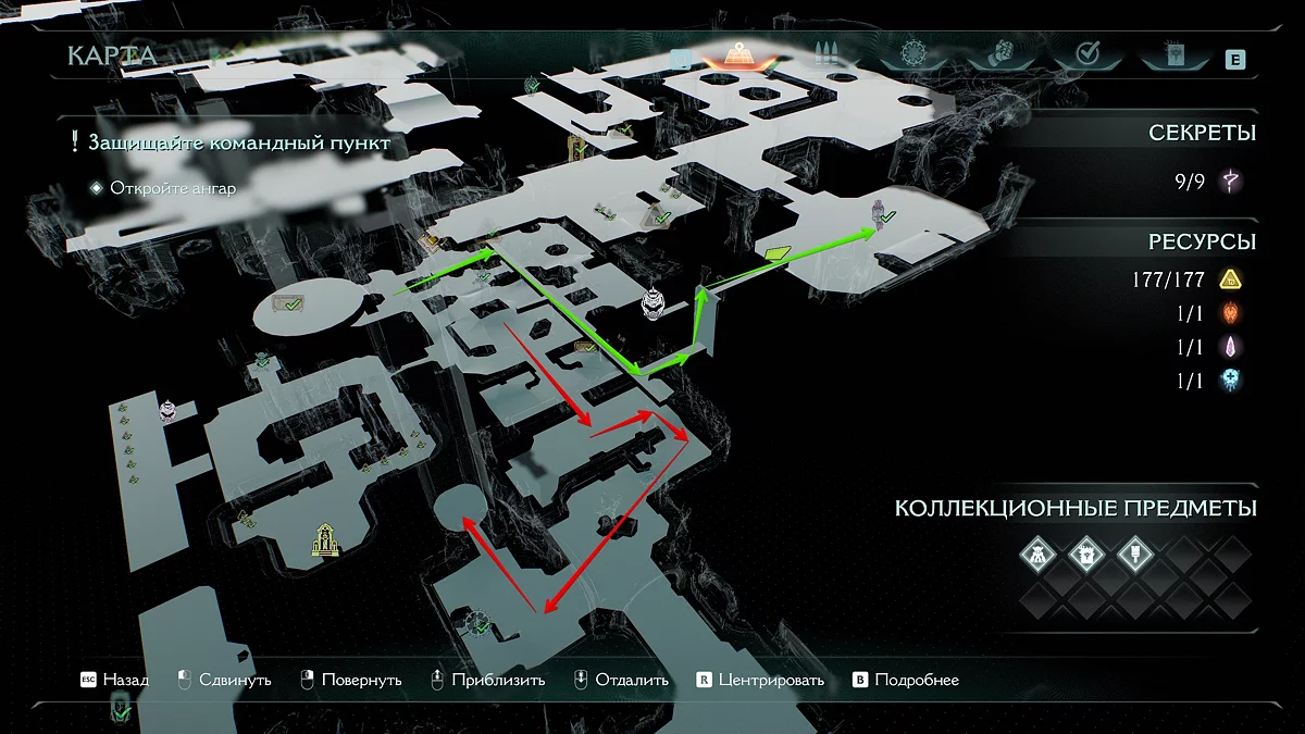 Откройте две двери секретными ключами. Для начала необходимо раздобыть фиолетовый секретный ключ. Получите карту от ангара (это примерно половина главы), затем прыгайте на нижний уровень локации и двигайтесь по указанному ниже маршруту.