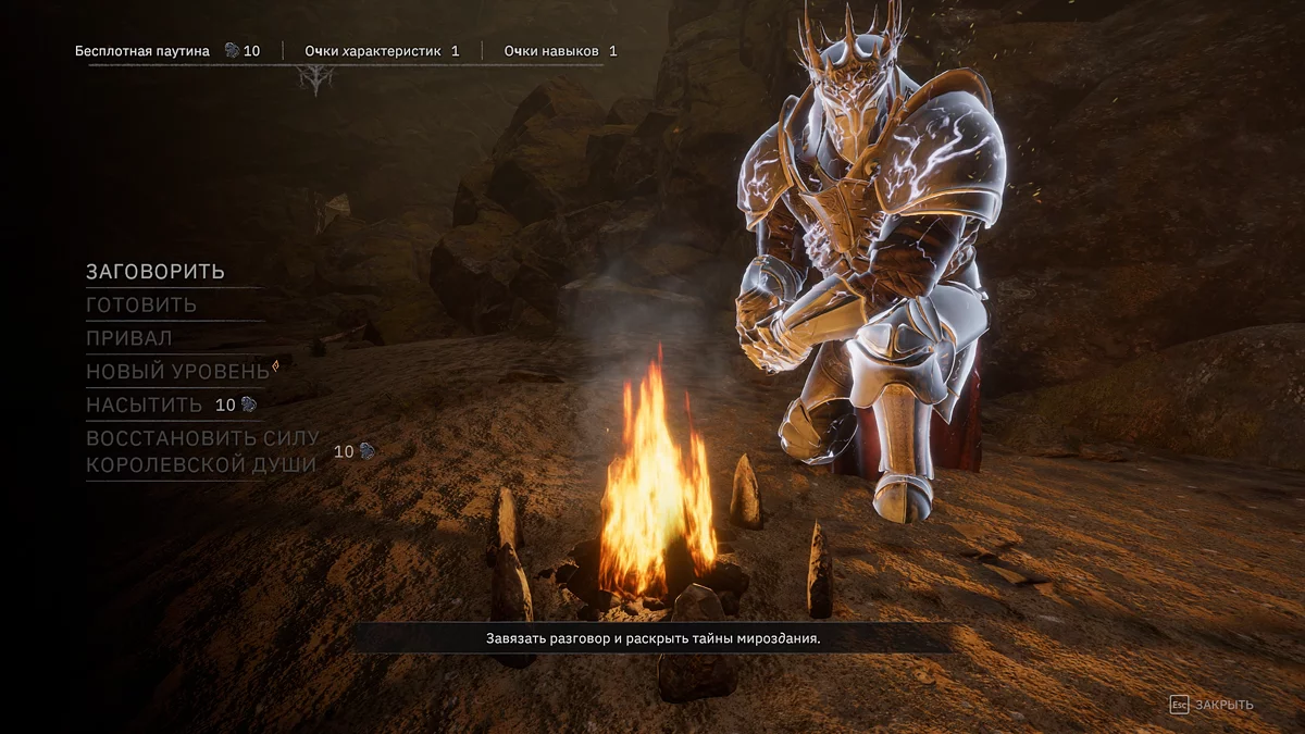 В любом случае после разговора с красным рыцарем получите бесплотную паутину и возможность ставить лагеря. Костры позволяют отдыхать, распределять очки навыков, силы предтеч, готовить пищу и зелья, крафтить, восстанавливать души и воспроизводить воспоминания короля.
