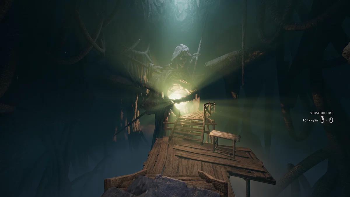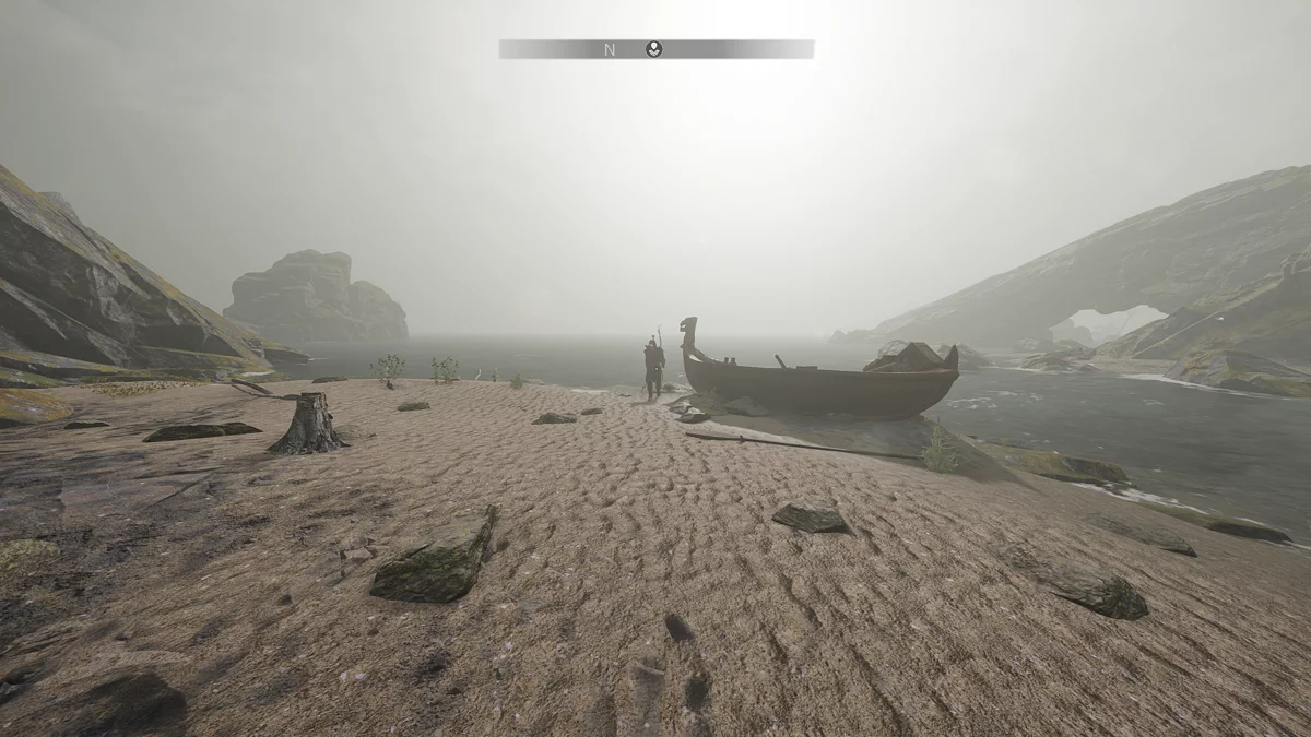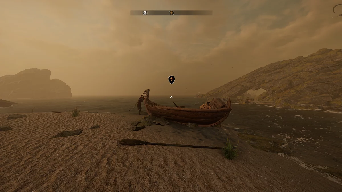 Подойдите к лодке и нажмите на кнопку «Взаимодействие». Затем начнётся кат-сцена, в которой шлюпку разбивает неведомое существо из бездны. В результате кораблекрушения вы окажетесь в одиночестве на берегу материка. Далее нужно двигаться на север в крепость «Рога Юга». С этого момента можно считать, что пролог пройден. Теперь можно изучать мир игры или следовать дальше по сюжету.