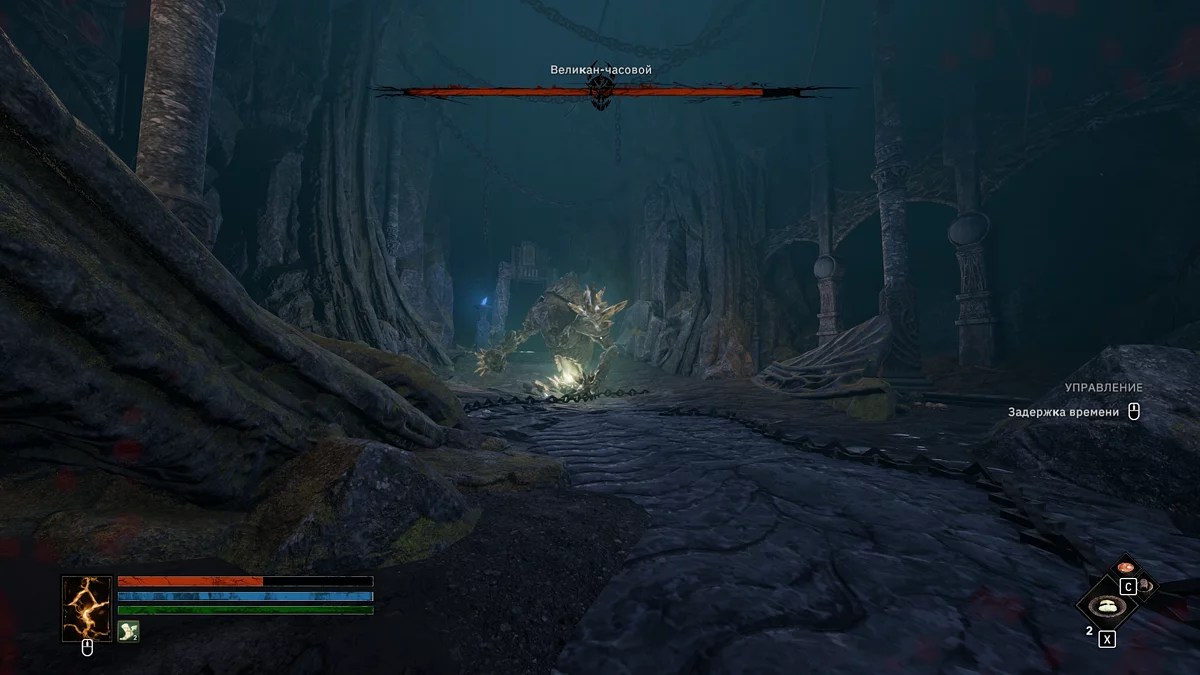 Оказавшись в последнем зале, рекомендуем сохраниться, так как впереди ждёт сюжетный босс — «Великан-часовой», который появится из-под земли, когда герой окажется примерно в центре помещения.