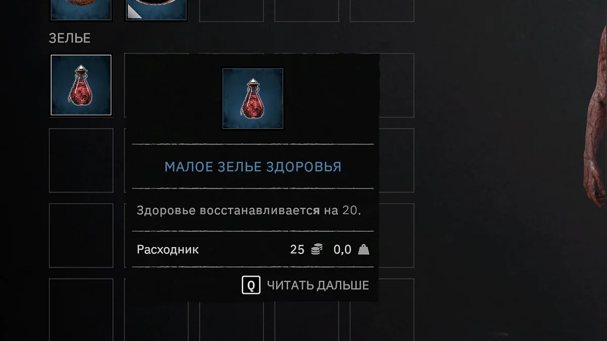 В противоположной камере найдите за кроватью «Малое зелье здоровья». Зелья – алхимические снадобья, как правило, моментально восстанавливают характеристики героя, а также могут временно повышать их или же влиять на атрибуты и иные параметры.