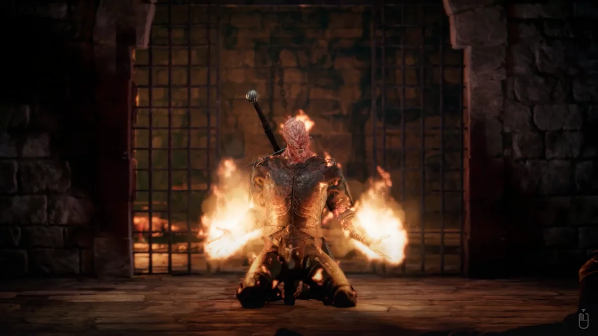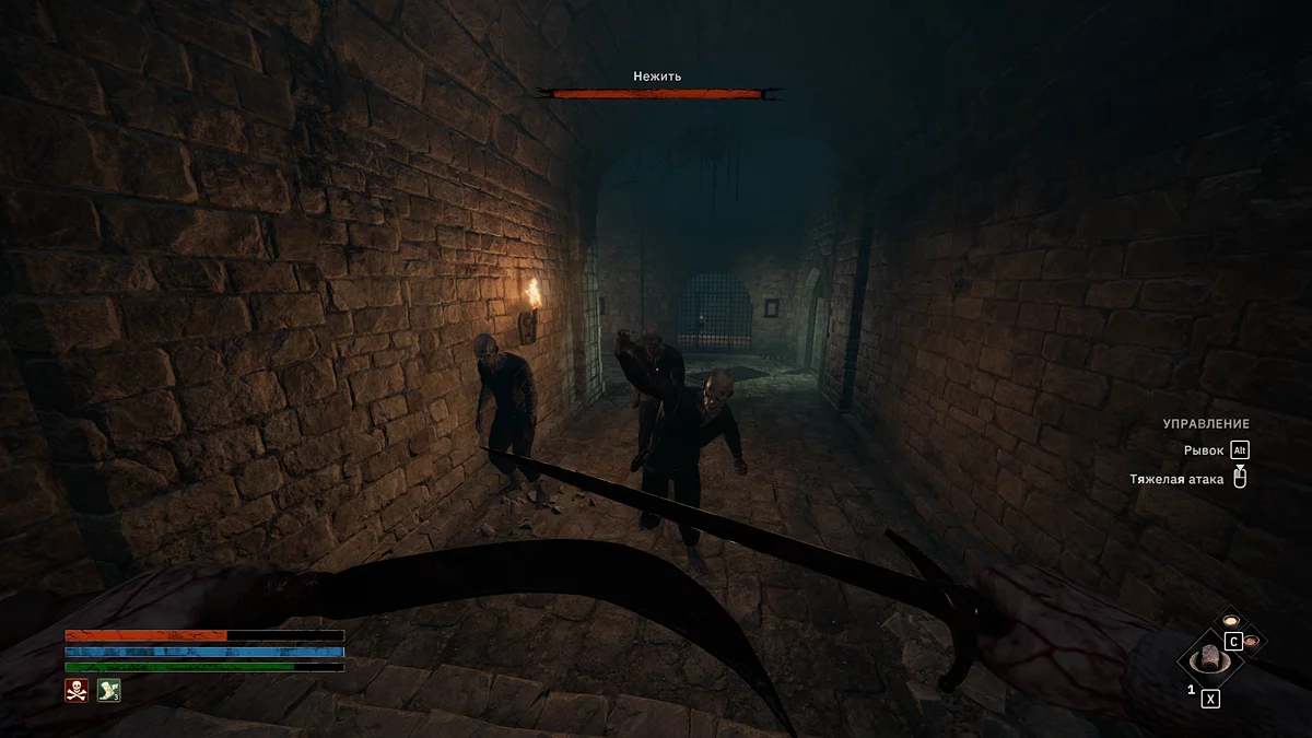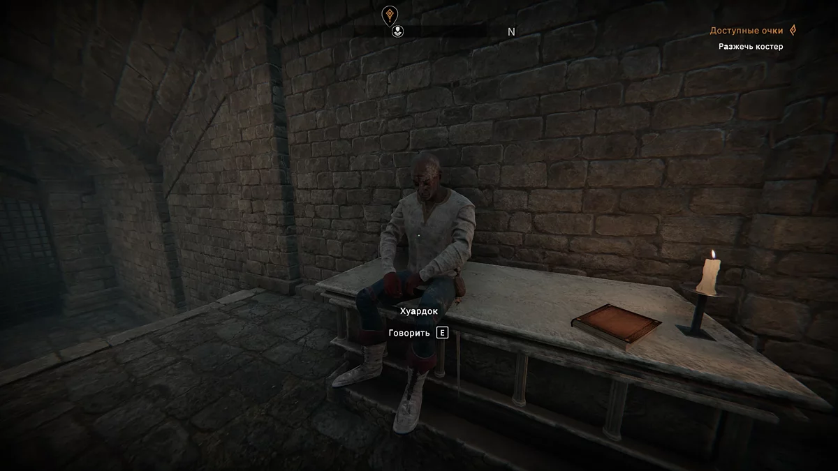 Заберите с тела надсмотрщика «Тюремный ключ», которым вы откроете большинство камер. Теперь идите по следам спасителя. Увидев мертвого стражника на стуле, нужно повернуть налево, однако вы можете пойти направо и испытать себя в первом бою. Противник будет вооружен кинжалом. Боевая система в игре достаточно проста: блокируйте атаки или уклоняйтесь и атакуйте, пока противник готовится к следующему удару.