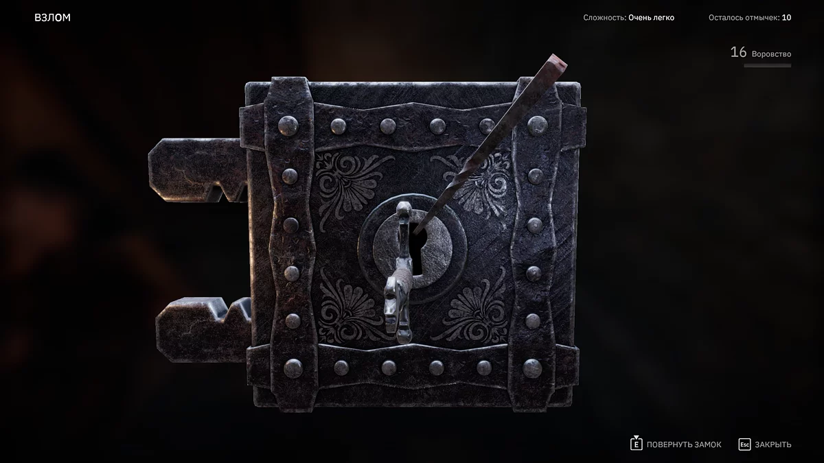 Рядом со столом смотрителя находится запертый шкафчик с зельями. Взлом – используя отмычку, найдите угол, при котором безостановочно проворачивается замочная скважина.