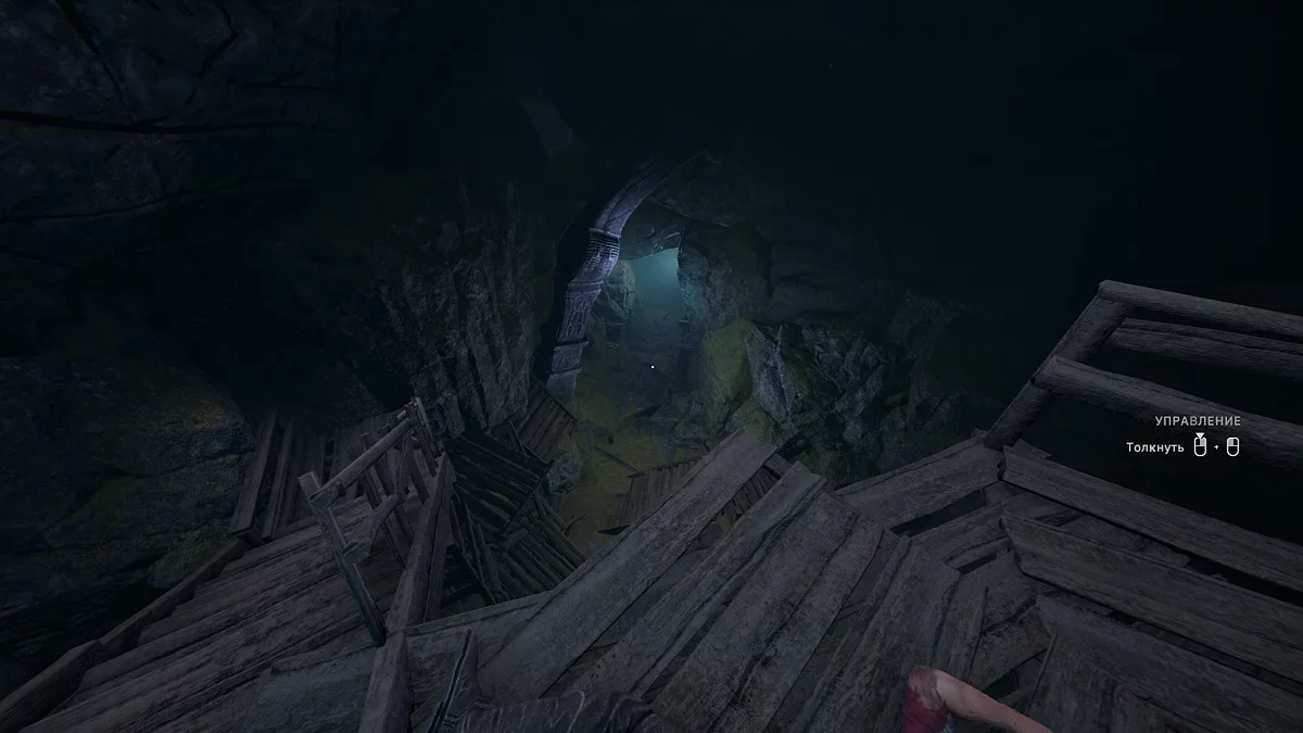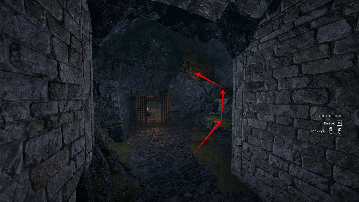 Двигайтесь вперед, пока не увидите слева в стене кирку. Обязательно возьмите инструмент и всегда держите в инвентаре. Киркой можно разбивать каменные завалы и добывать руду.