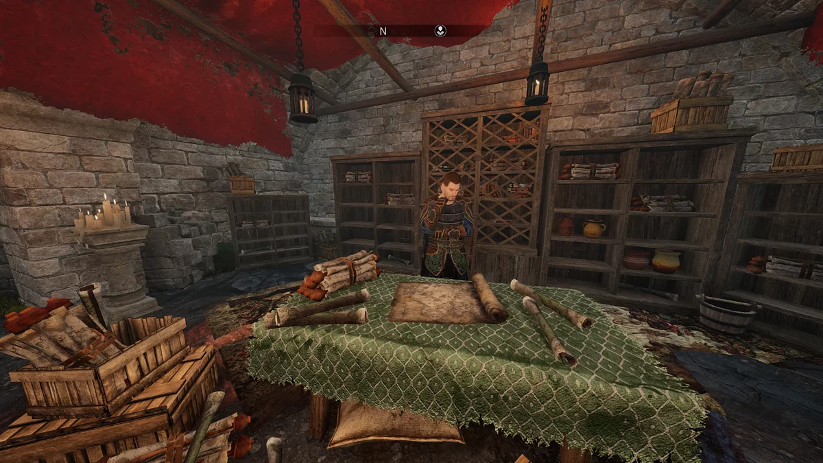 Затем обыщите кабинет нападавшего, где найдёте мозг — такие предметы отмечаются в рюкзаке как «Алхимия». На полках у стола стоят бутылки — подобные ресурсы для крафта в инвентаре относятся к категории «Ручная работа».Возвращайтесь к сюжетному пути. Можете зайти в буфет за стулом стражника, в котором можно раздобыть ресурсы и «Старое письмо». Это письмо начнёт первый побочный квест «Незабываемое» (The Unforgettable). Заранее скажем, что побочка завершается на материке после того, как вы покинете остров.