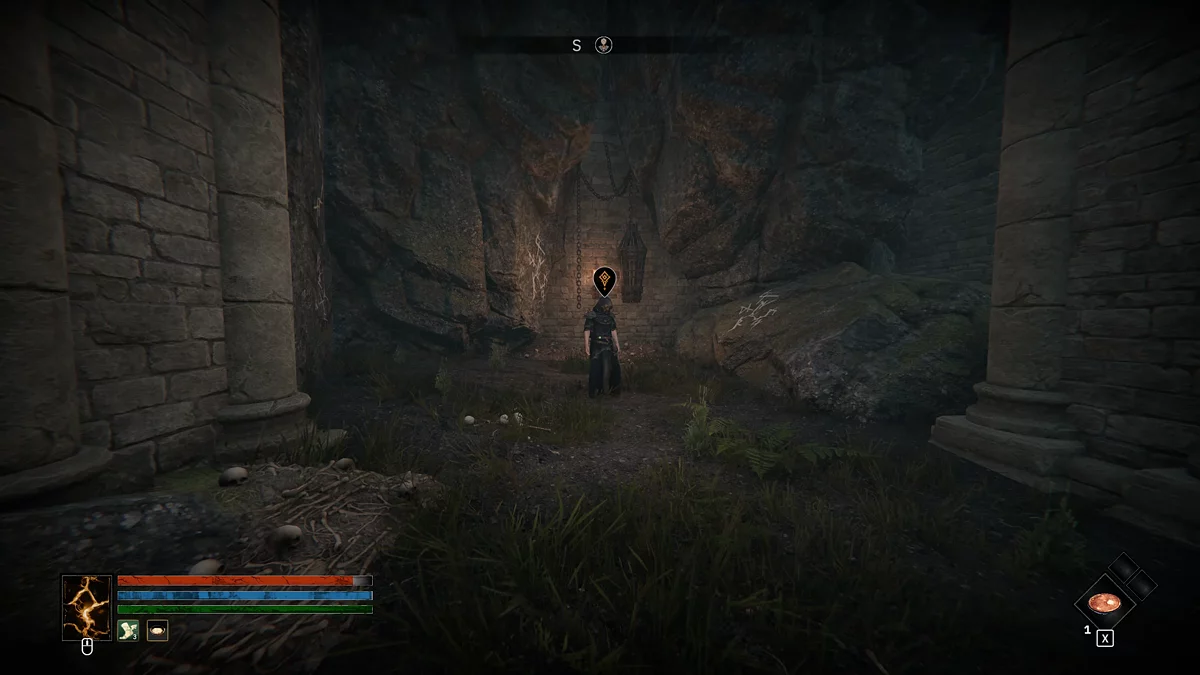 Вернитесь к рыцарю и двигайтесь по сюжету. Убейте нежить в конце коридора и спускайтесь по строительным лесам вниз. По пути увидите черные заросли и постамент с кнопкой, пока что не обращайте внимания, позже у вас появится возможность с этим взаимодействовать.