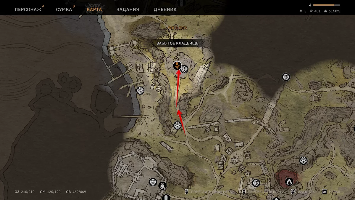 От лагеря охотника двигайтесь по дороге на север, на развилке поверните налево. Зачищать «забытое кладбище» от скелетов не обязательно, можно просто пробежать мимо, не вступая в бой, на квест это никак не влияет.