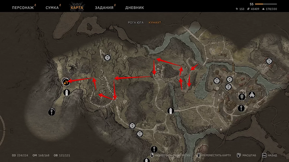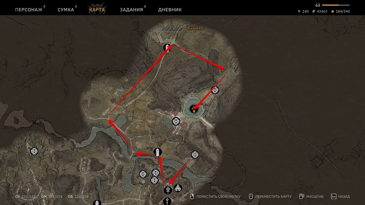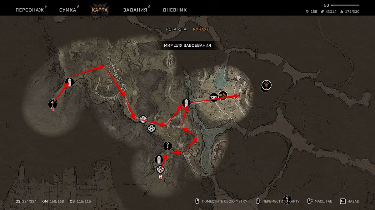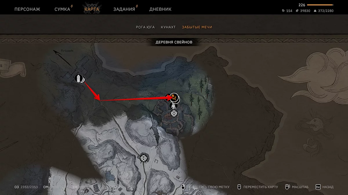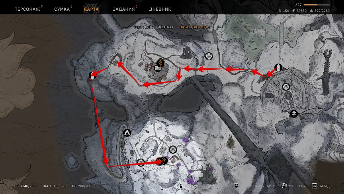 Отправляйтесь в Кунахт через северные ворота. Следуйте по дороге прямо, никуда не сворачивая. Пройдите через облако мари к плетёному человеку, прыгайте вниз, поверните направо и войдите в пещеру, где нужно активировать символы: Экскалибур, щит Паламеда, корона Артура. Затем откроется портал, являющийся точкой невозврата.