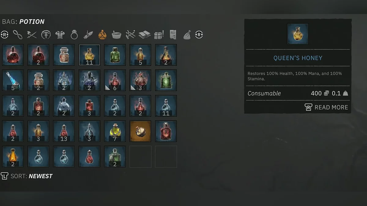 Чтобы пережить истощение здоровья, вам понадобится «Мед королевы» (Queen's Honey), чрезвычайно мощное лечебное зелье, которое быстро и полностью восстанавливает ваше здоровье за одно использование. Этот предмет является наградой за поддержку пчел во время квестовой линии «Противостояние выглядит как надежда».