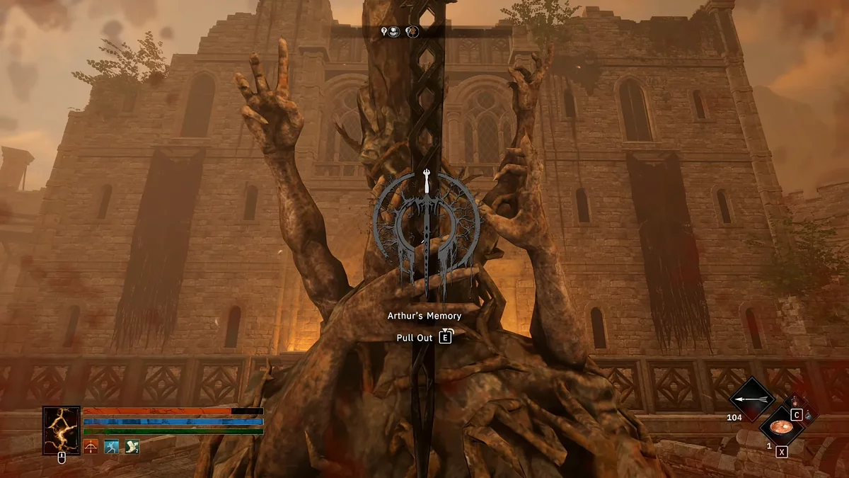 Подойдите к статуе «Память Артура» и взаимодействуйте с ней, чтобы начать вытаскивать меч. Как только ваше здоровье начнет падать, используйте «Мед королевы», чтобы полностью его восстановить. Повторяйте этот процесс, пока анимация не завершится и легендарный меч не окажется в ваших руках.