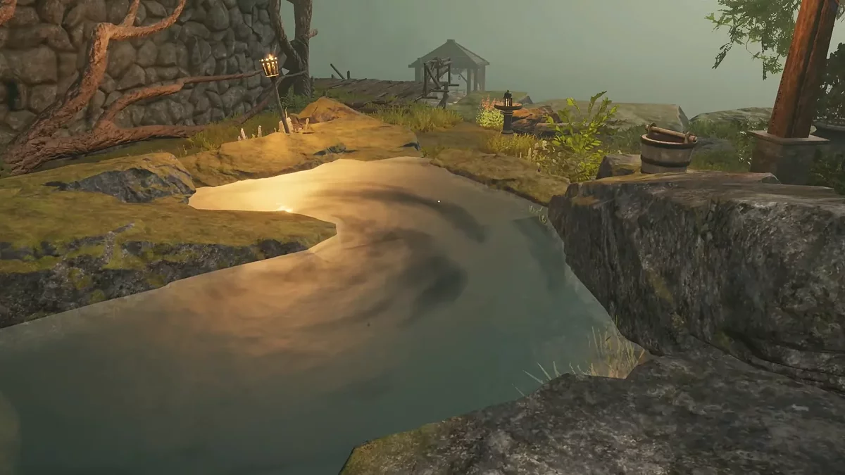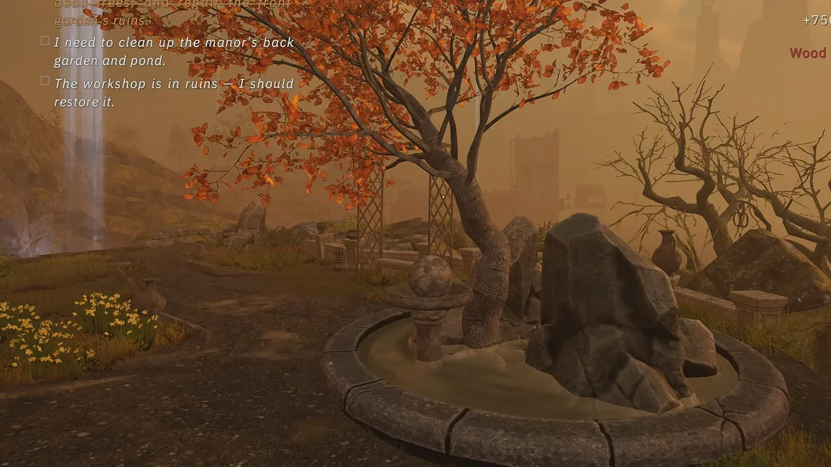 - Соберите пять единиц древесины и отправляйтесь в заднюю часть особняка. Там есть зона, где находится пруд. Отремонтируйте его.