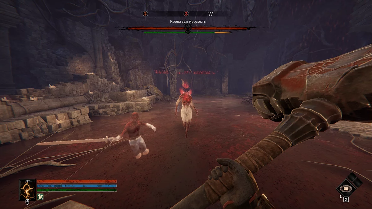 Откройте ворота с помощью печати и убейте «кровавую мерзость». Босс призывает мечника, испускает ядовитые облака и пуляет фаерболами. Старайтесь бить в спину, когда чудище готовится к новой атаке.