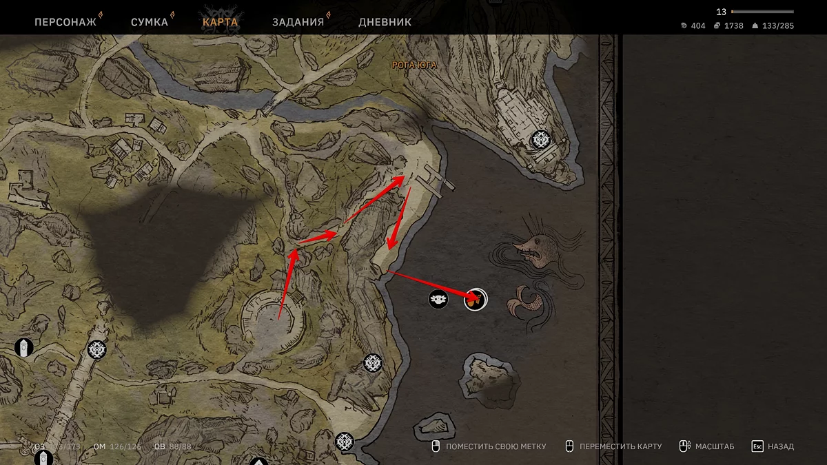 Отправляйтесь из крепости в деревню, потом у камня перемещения поверните налево, двигайтесь вдоль берега и зайдите за скалу. Выкопайте сундук и достаньте множество ценных предметов.