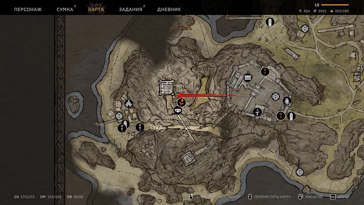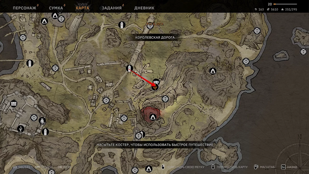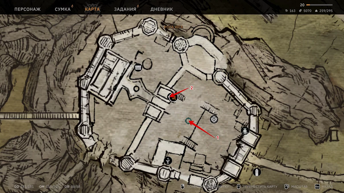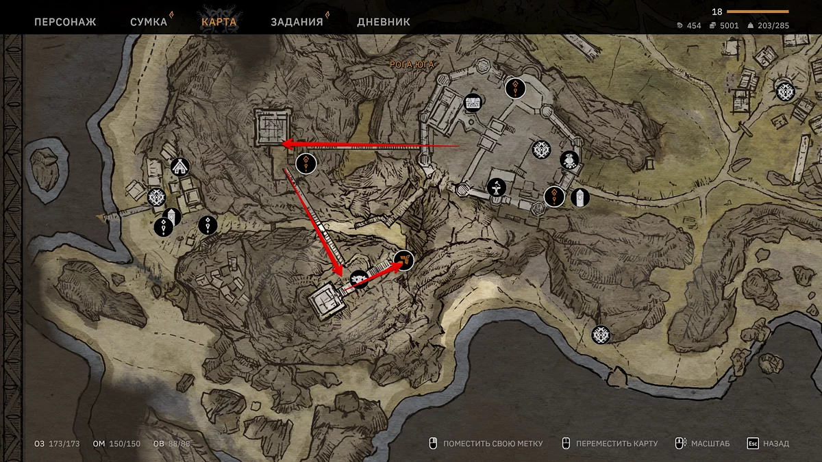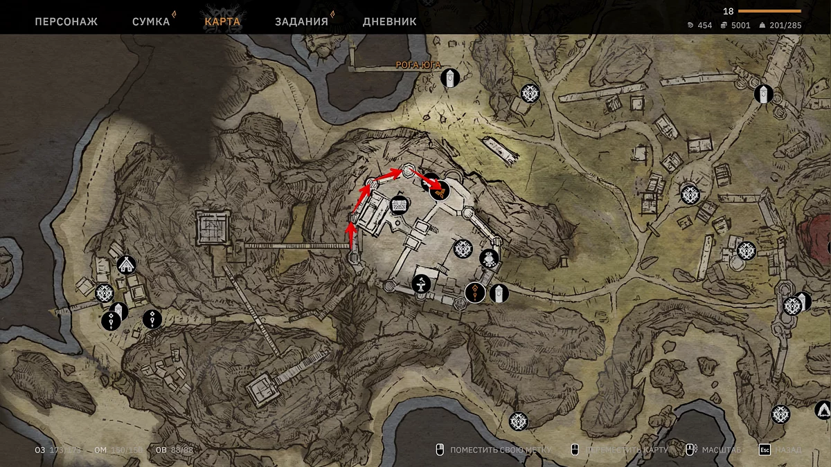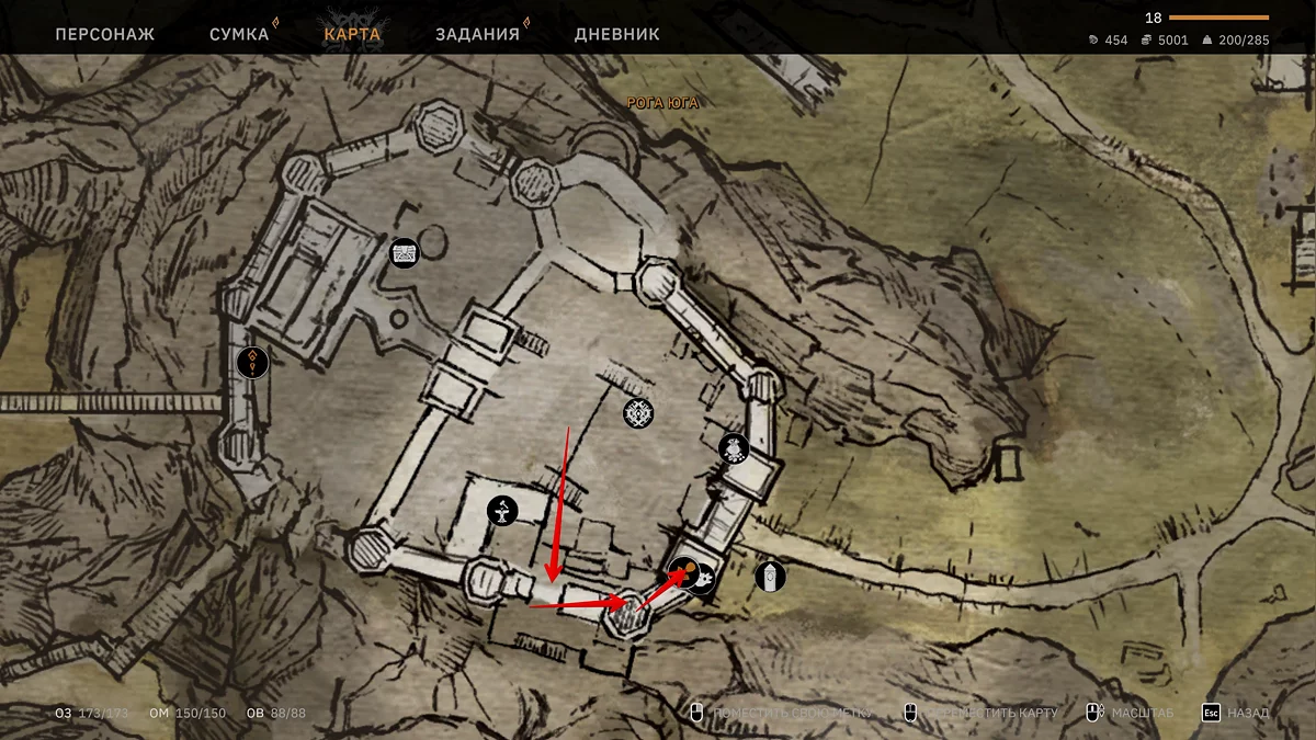 Выйдете из крепости, двигайтесь до разрушенного рынка и пройдите через брешь в стене слева от камня быстрого перемещения «Королевская дорога». Следуйте на северо-запад и обойдите «Архишпиль».