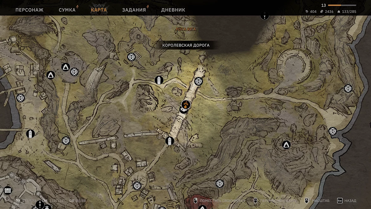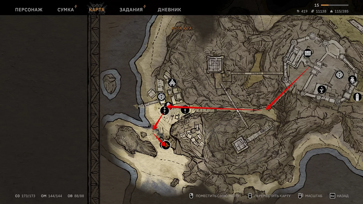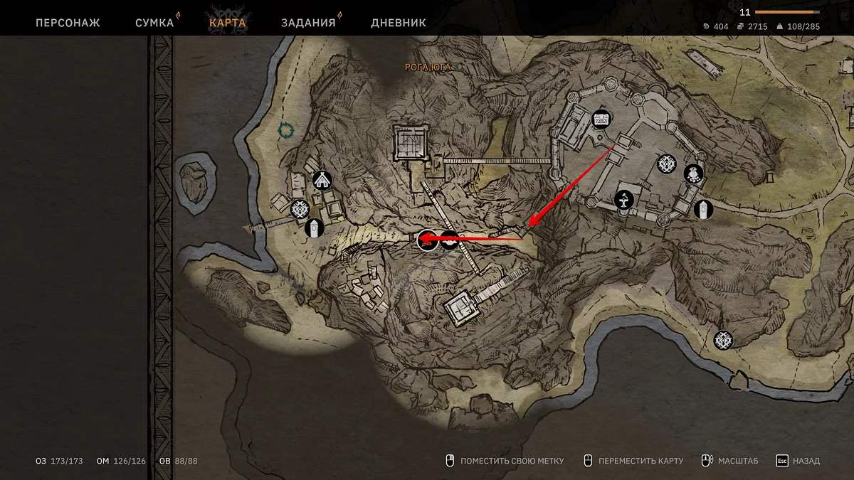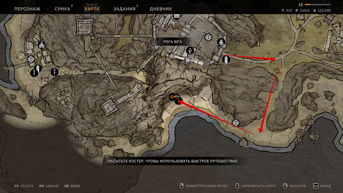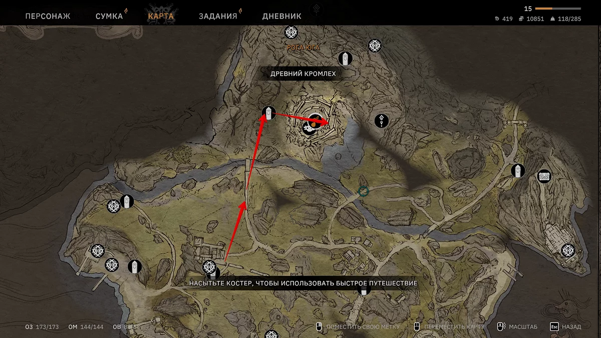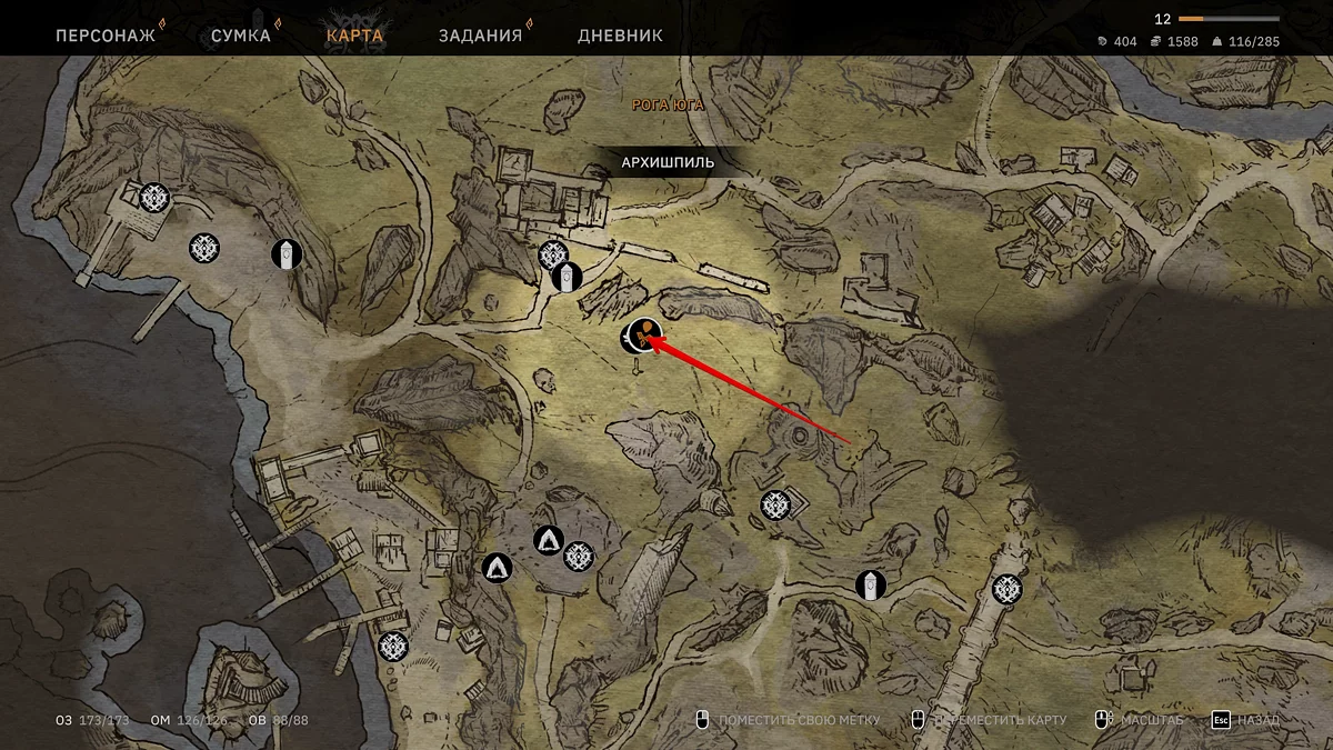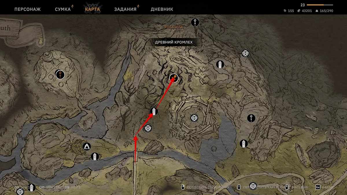 Выйдете из крепости, двигайтесь до разрушенного рынка и пройдите через брешь в стене слева от камня быстрого перемещения «Королевская дорога». Следуйте на северо-запад и обойдите «Архишпиль».