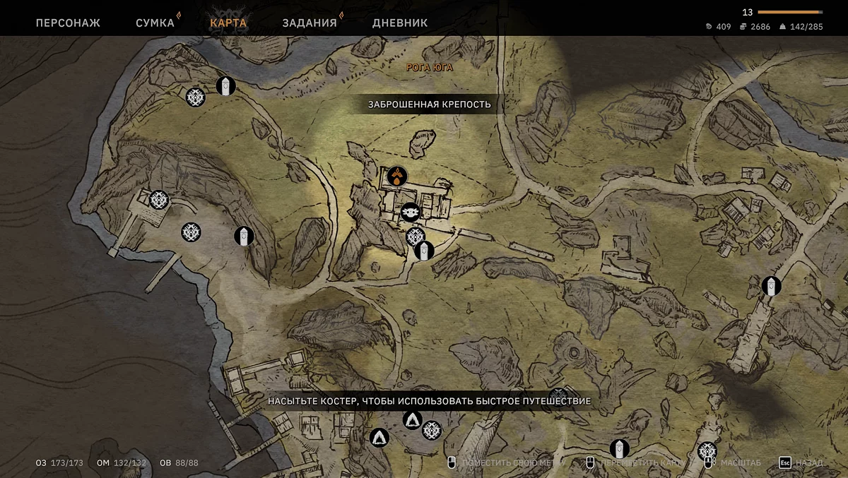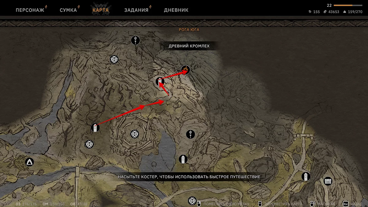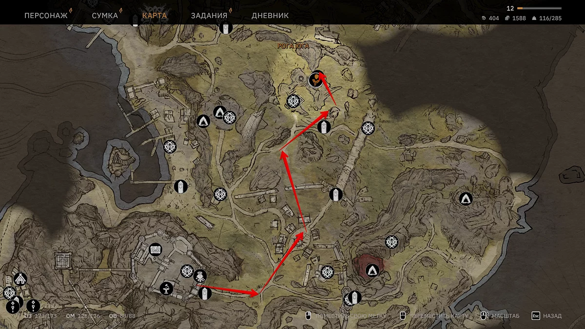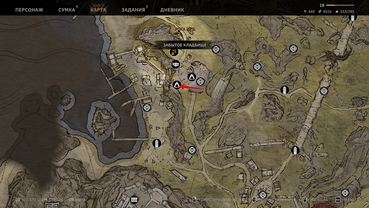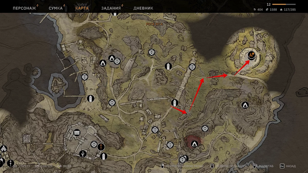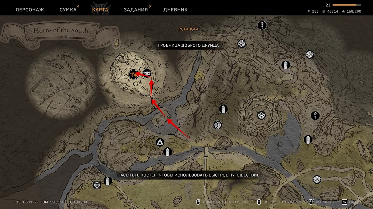Двигайтесь на север от «Заброшенной крепости», пересеките реку и поверните направо у камня перемещения «Древний кромлех». Зайдите в центр и возложите на саркофаг компоненты. Затем поговорите с духами, которые в конце диалога дадут омелу, вернитесь к лекарю и расскажите, что произошло.